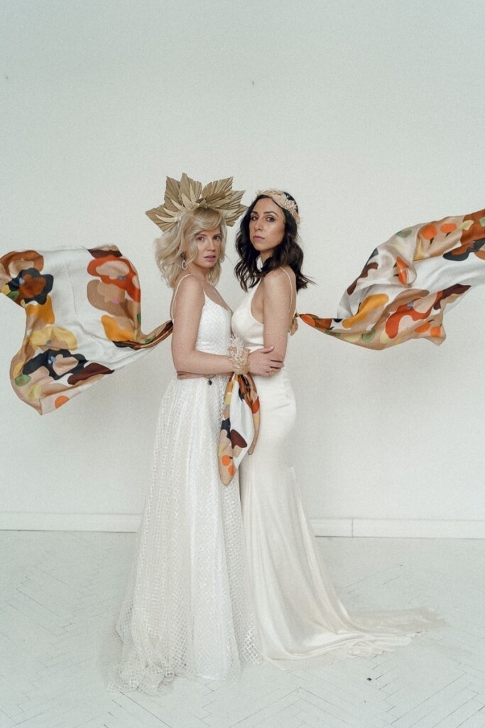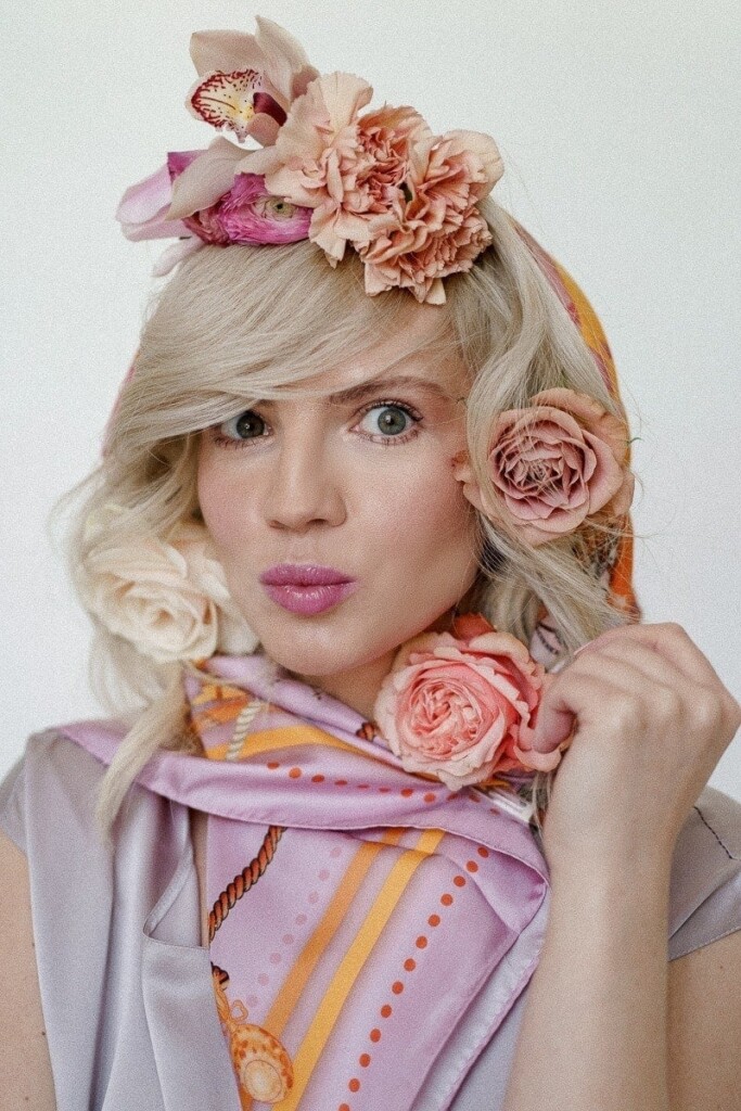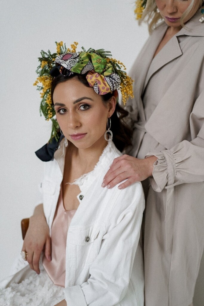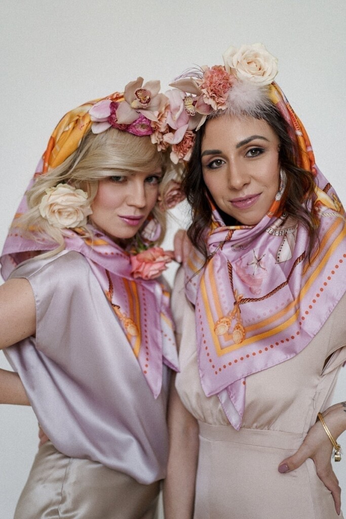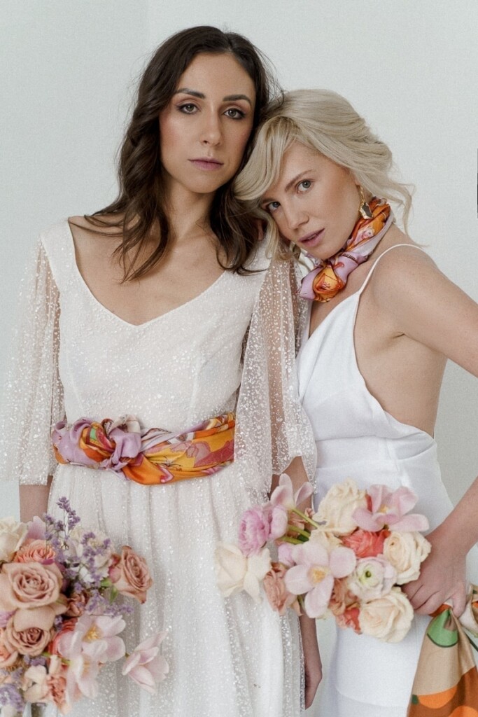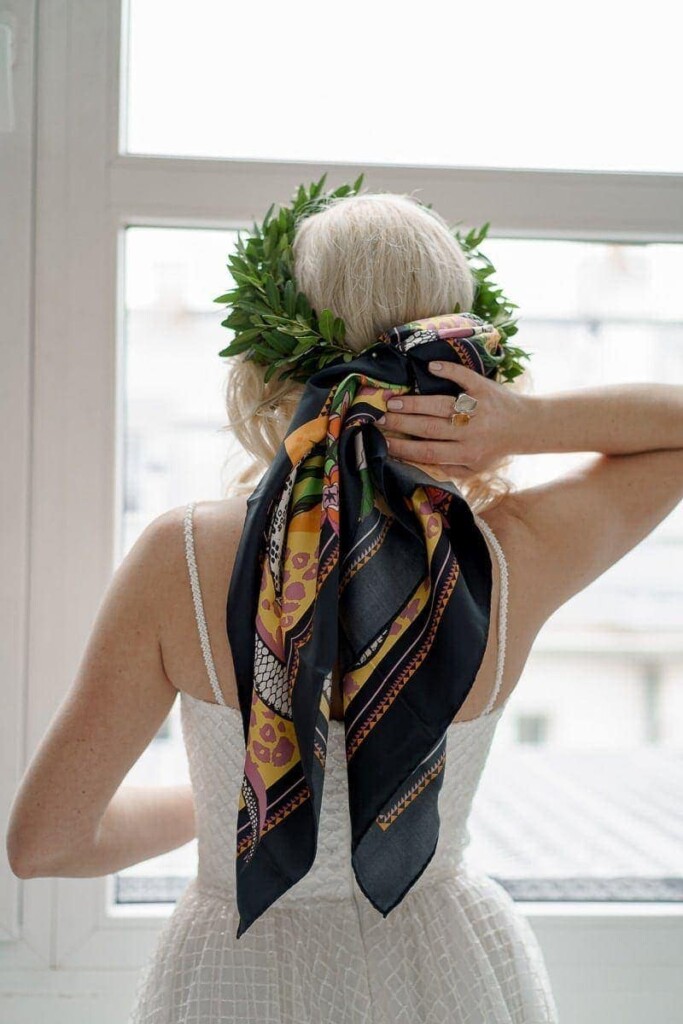Kolejną sesję zrealizowaliśmy we współpracy z Martą i Łukaszem, których możecie znać jako Muscari. Postanowiliśmy wspólnymi siłami połączyć jedwabne apaszki z motywem ślubnym. Zostały one wplecione w wianki, bukiety kwietne oraz korsarze. Ale też wykorzystane jako dodatkowy element stylizacji ślubnej np. pasek czy dodatek na szyję. Jako druga modelka udział w sesji wzięła Czytelniczka naszego bloga Dominika.