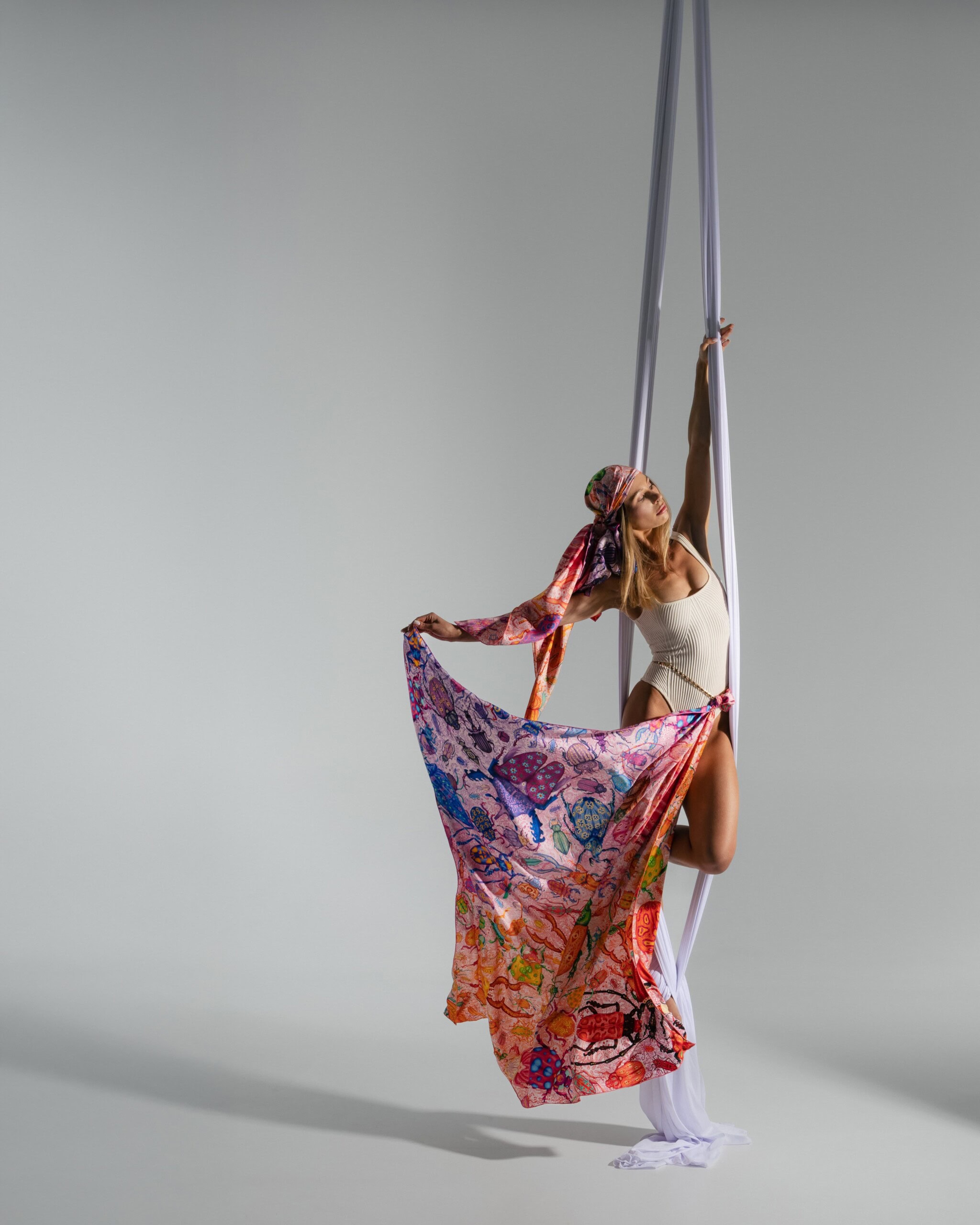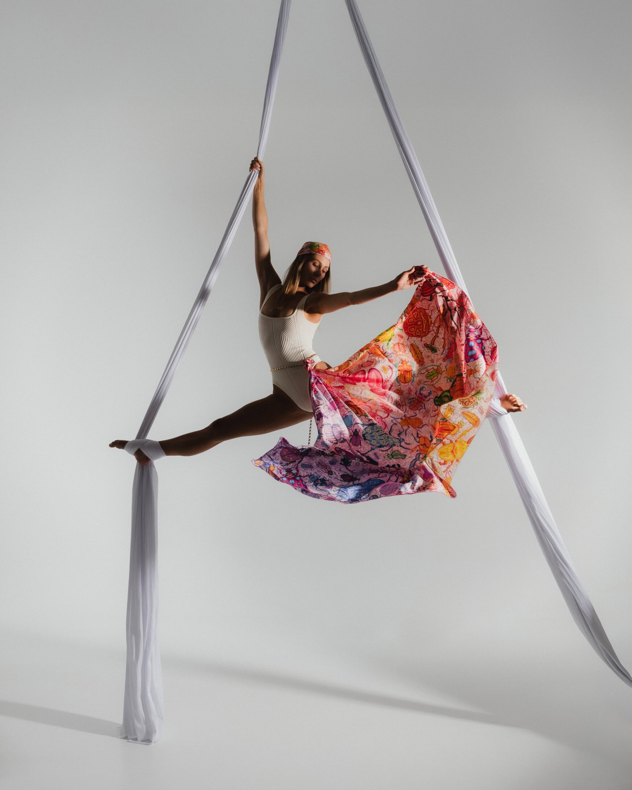 – Od dawna chodzę na zajęcia aerial jogi i od samego początku towarzyszy mi poczucie wyjątkowości tych chwil – oderwania od codzienności, unoszenia się ponad wszystko, co przyziemne. To czas, w którym mogę odkrywać swoją kobiecość na nowo, w ruchu, który jest jednocześnie delikatny i silny. Chciałam, aby ta sesja oddała właśnie to uczucie – wolności, swobody i lekkości, które daje mi aerial. Dlatego połączenie jedwabnych apaszek z ruchem Natalii było dla mnie czymś więcej niż koncepcją samej sesji zdjęciowej – było osobistą opowieścią o tym, jak w tańcu materiału i ciała rodzi się magia. Magia, która porusza – podsumowuje Marta Lech-Maciejewska.