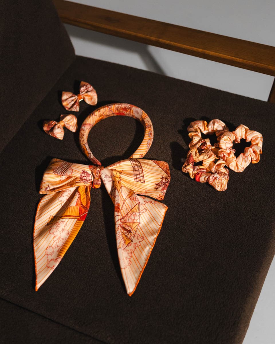 Add a touch of charm to your hairstyle with our silk headband featuring a long, wide sash. Made from premium twill silk, it boasts a soft sheen and luxurious feel, gently caressing the hair.