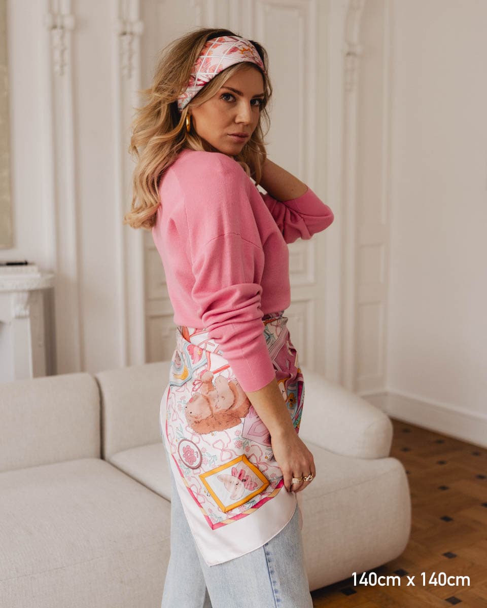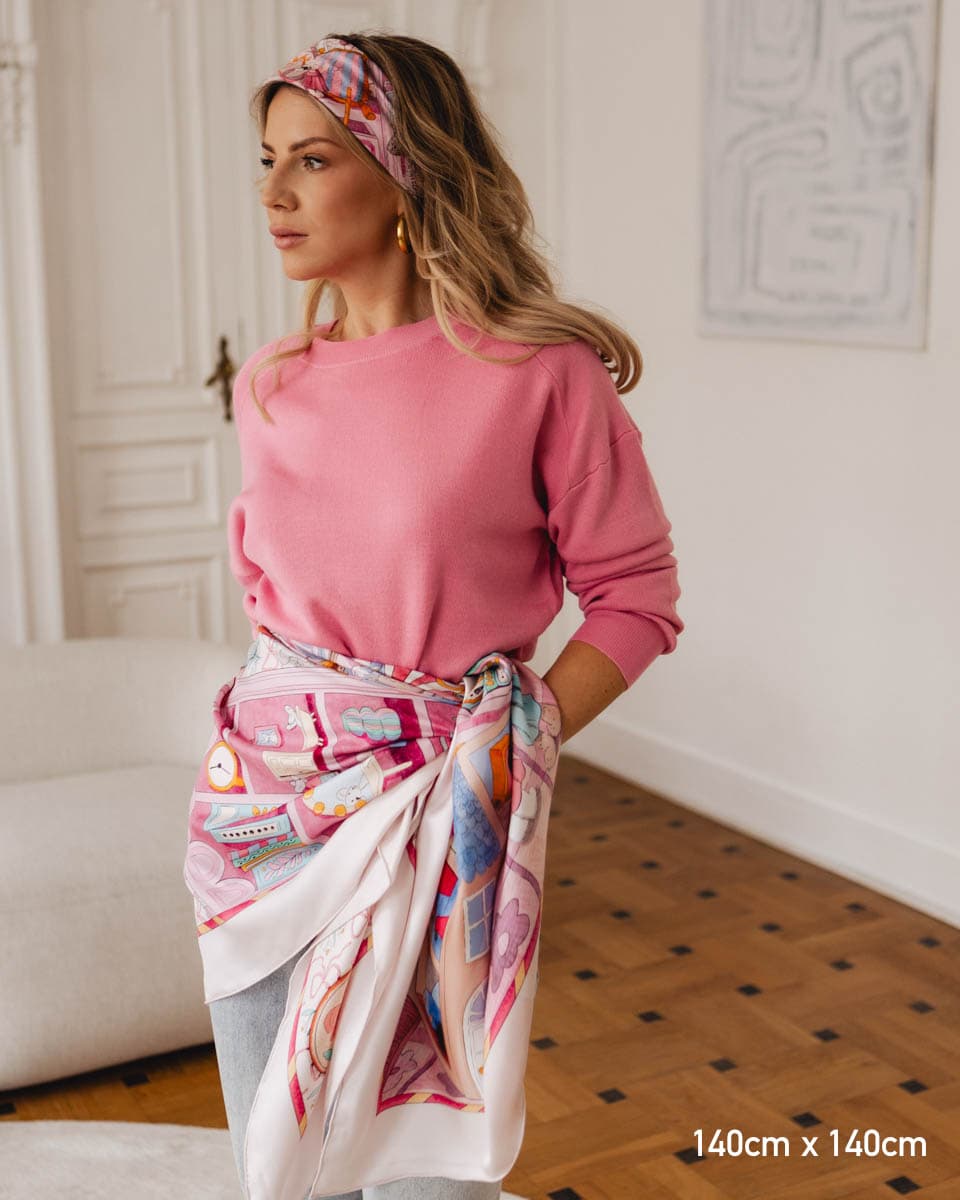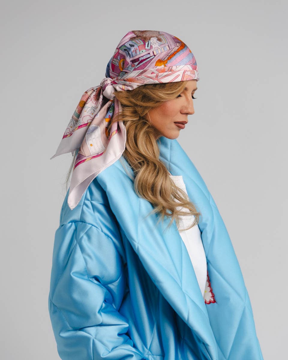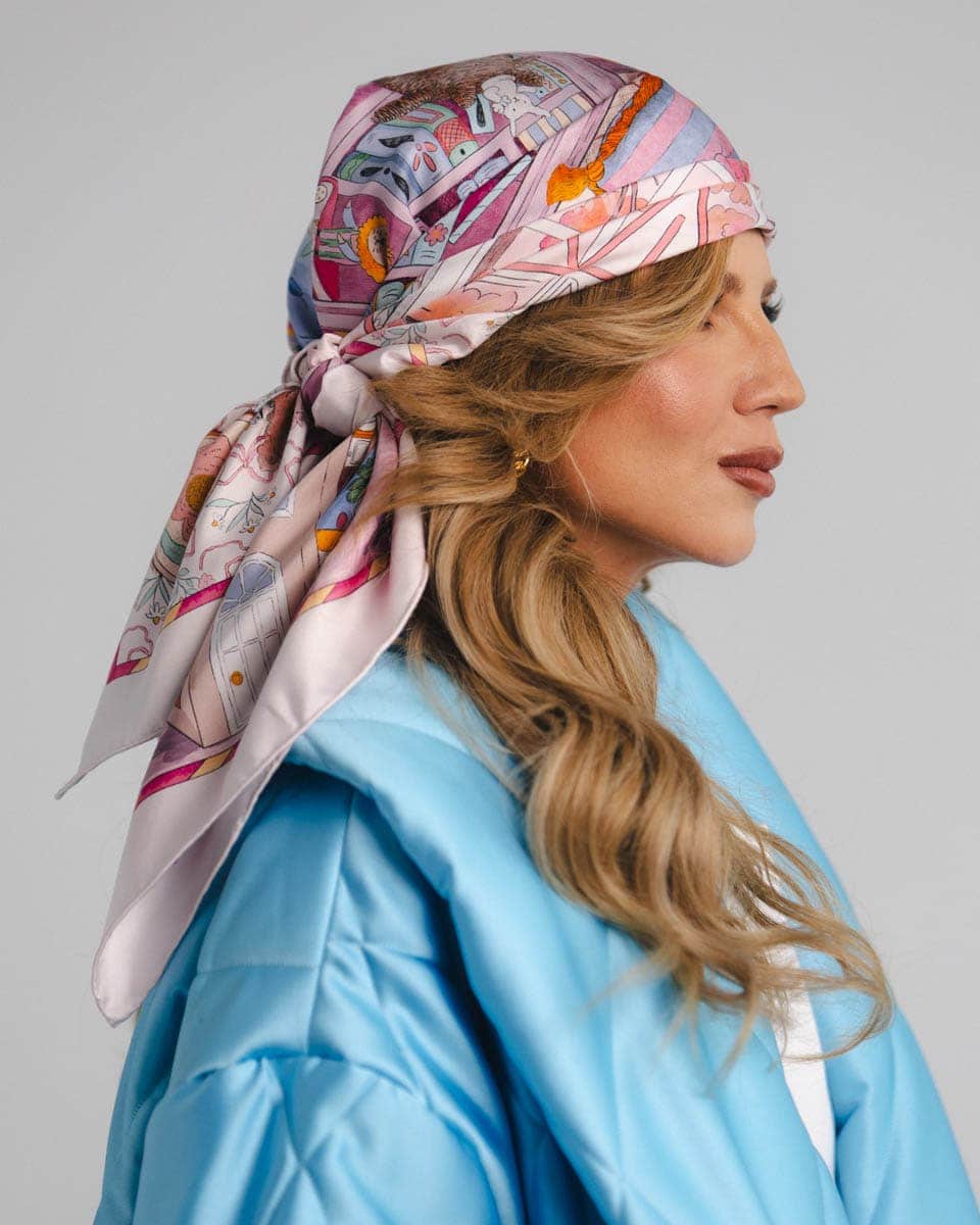 Have you ever wondered what happens in a room when the lights go out? Pink Whispered Tales scarf takes us into the world of childhood imagination. Into a place where favourite toys come to life the moment we look away. Soft pastels, gentle light streaming through the window, and cozy pillows create a space full of magic. Exactly the same magic we once believed in as children. Every detail recalls carefree evenings when teddy bears and dolls were our most loyal companions. This design is a tribute to the inner child still resting within us - all it takes is to let it awaken.