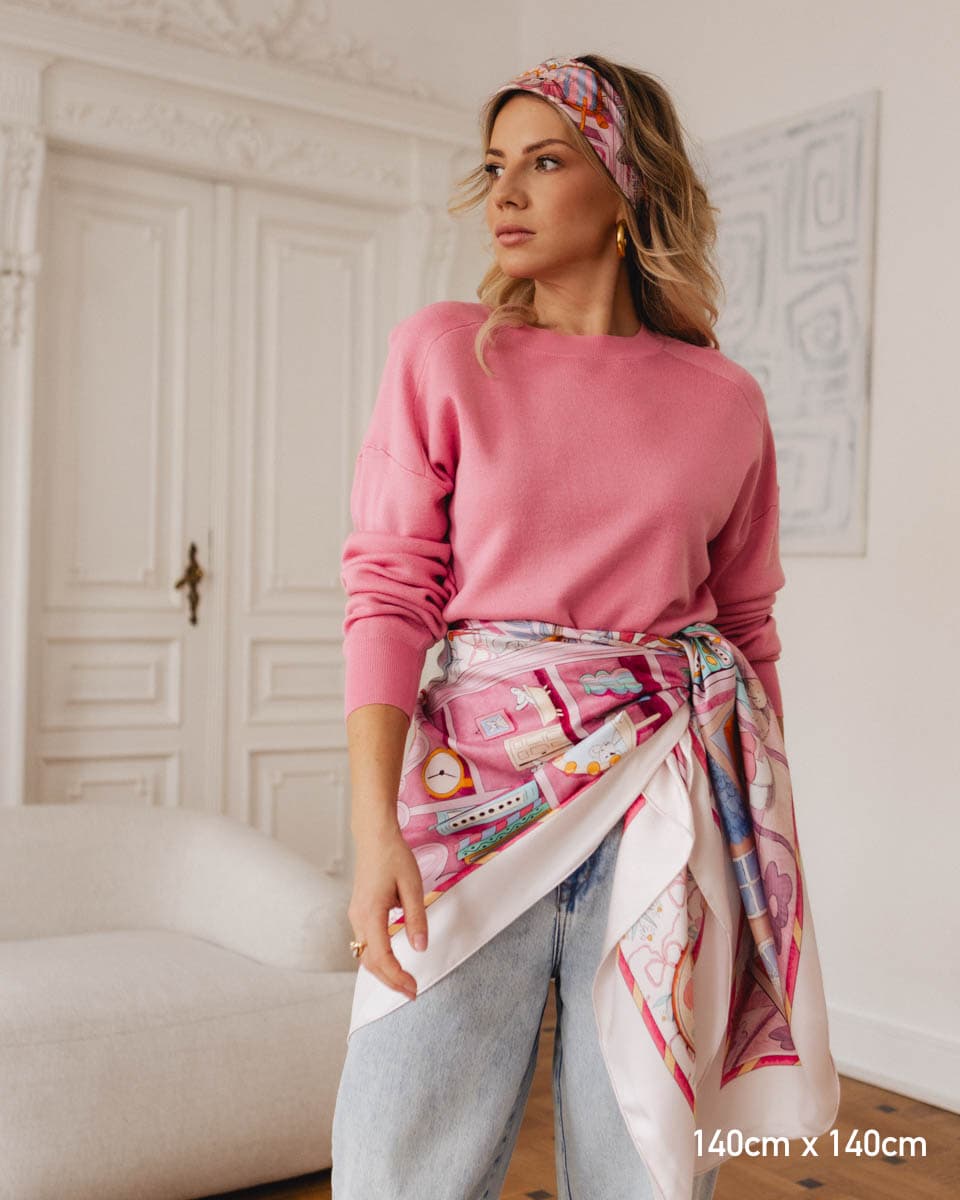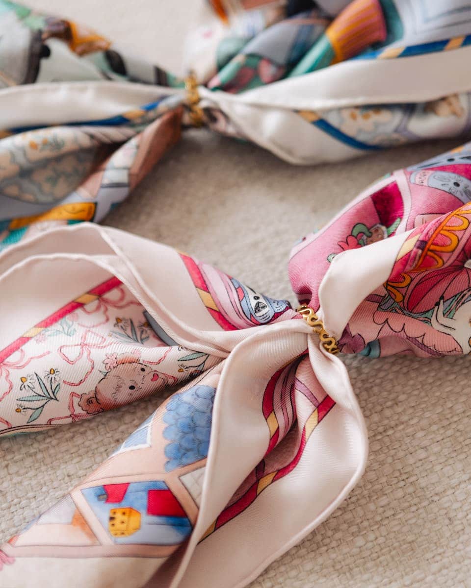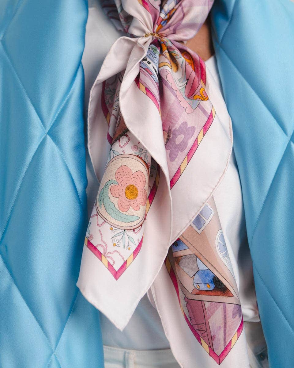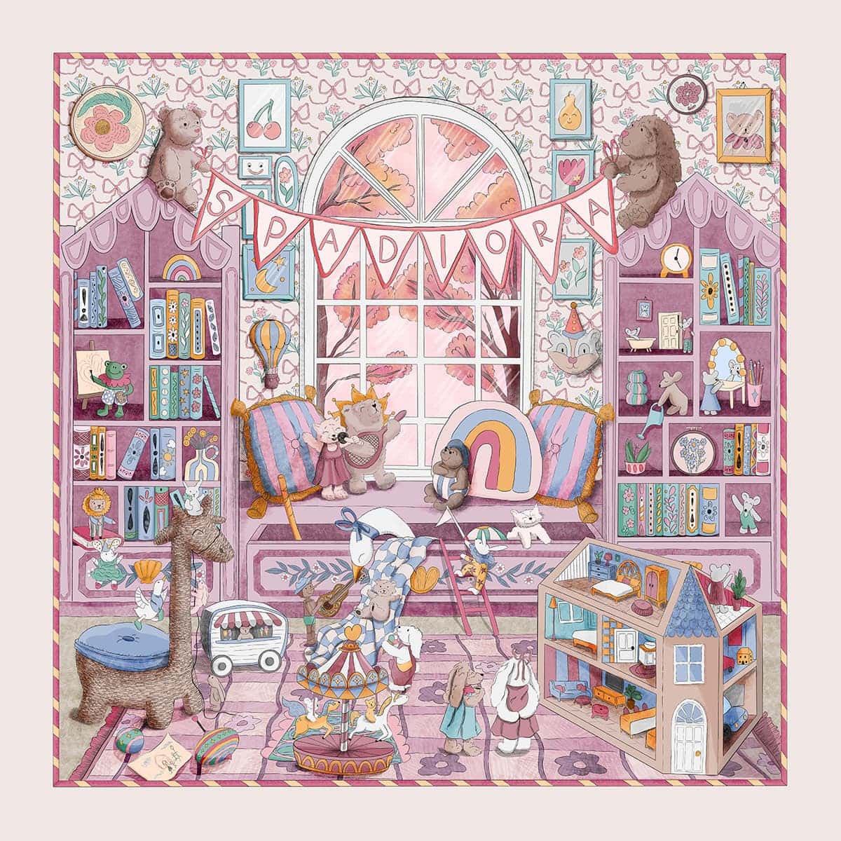 Have you ever wondered what happens in a room when the lights go out? Pink Whispered Tales scarf takes us into the world of childhood imagination. Into a place where favourite toys come to life the moment we look away. Soft pastels, gentle light streaming through the window, and cozy pillows create a space full of magic. Exactly the same magic we once believed in as children. Every detail recalls carefree evenings when teddy bears and dolls were our most loyal companions. This design is a tribute to the inner child still resting within us - all it takes is to let it awaken.