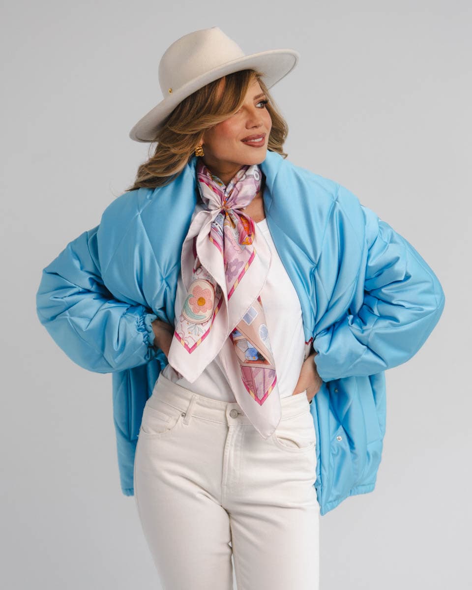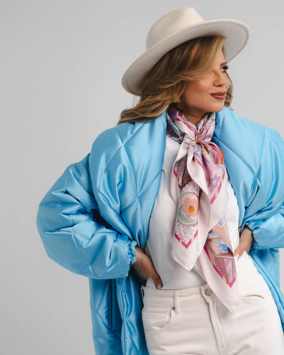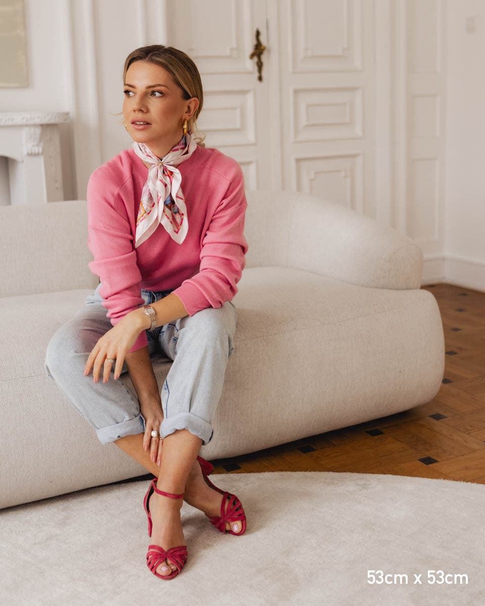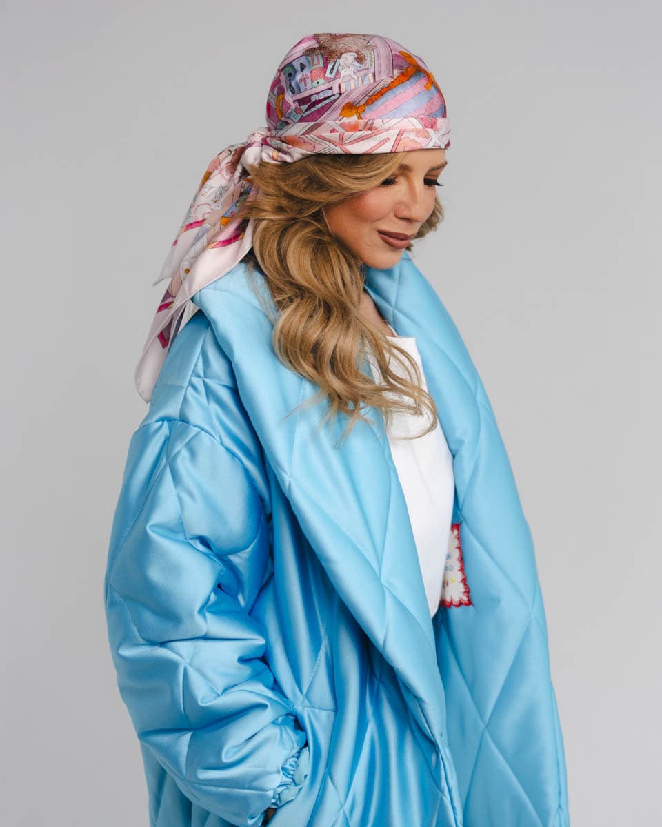 Have you ever wondered what happens in a room when the lights go out? Pink Whispered Tales scarf takes us into the world of childhood imagination. Into a place where favourite toys come to life the moment we look away. Soft pastels, gentle light streaming through the window, and cozy pillows create a space full of magic. Exactly the same magic we once believed in as children. Every detail recalls carefree evenings when teddy bears and dolls were our most loyal companions. This design is a tribute to the inner child still resting within us - all it takes is to let it awaken.