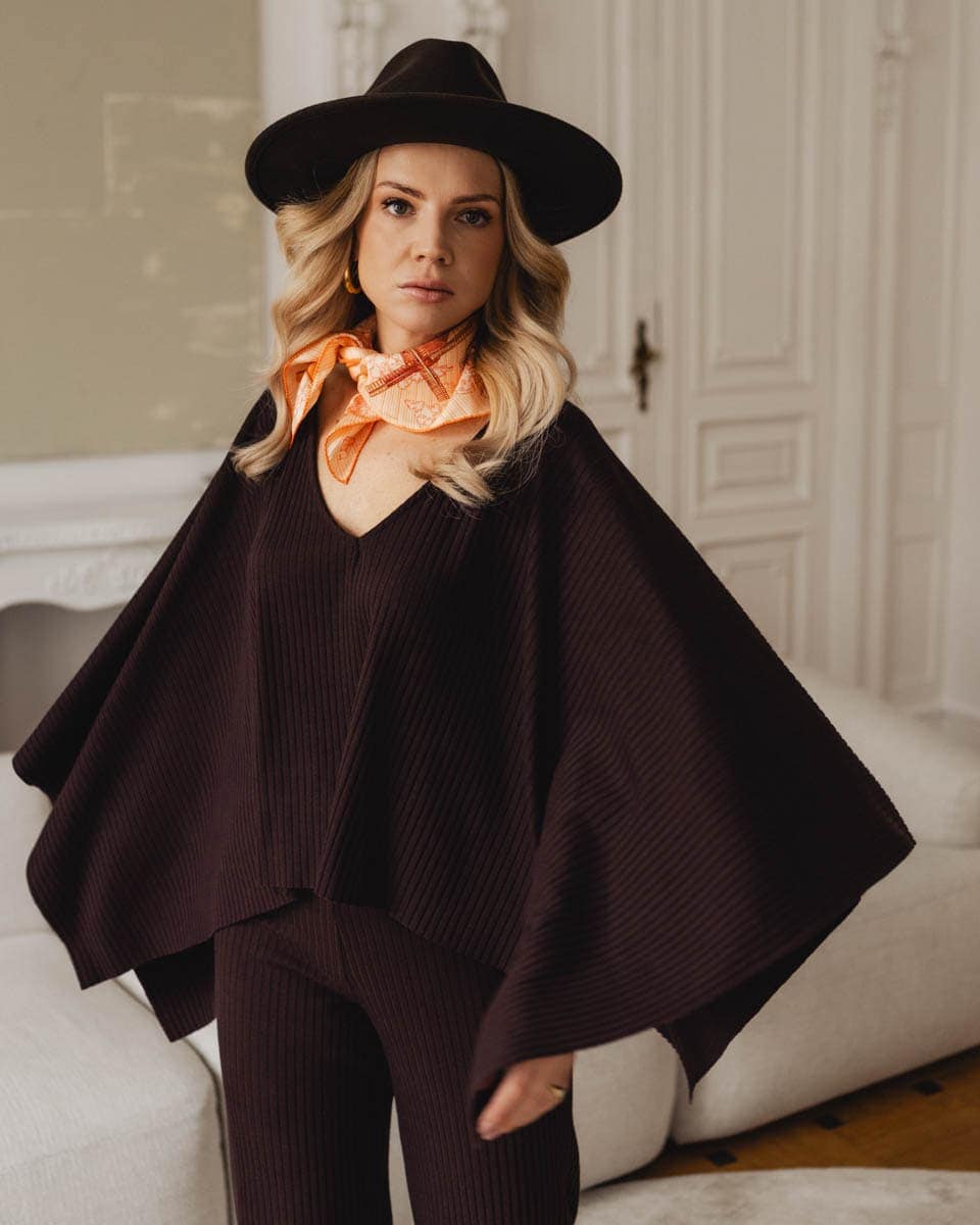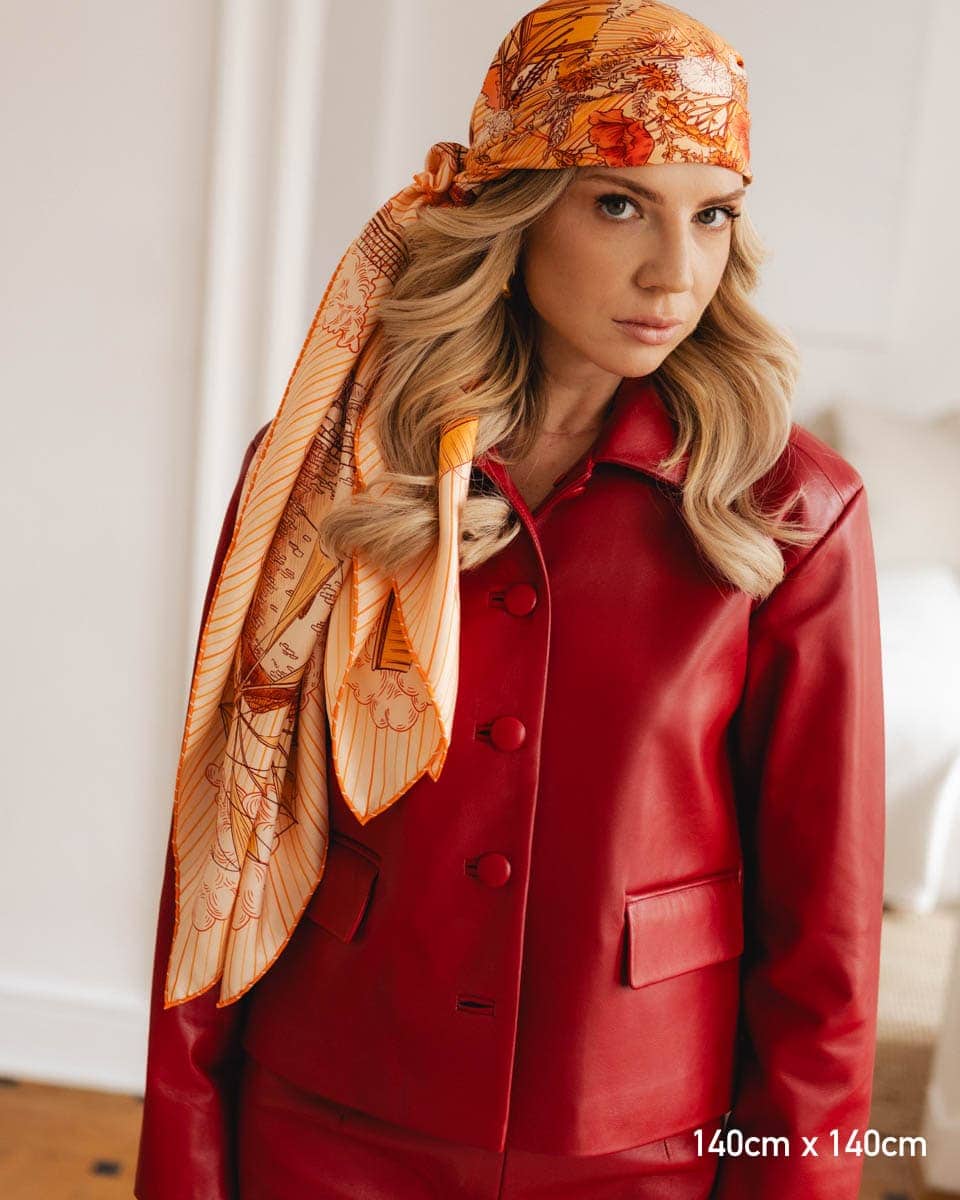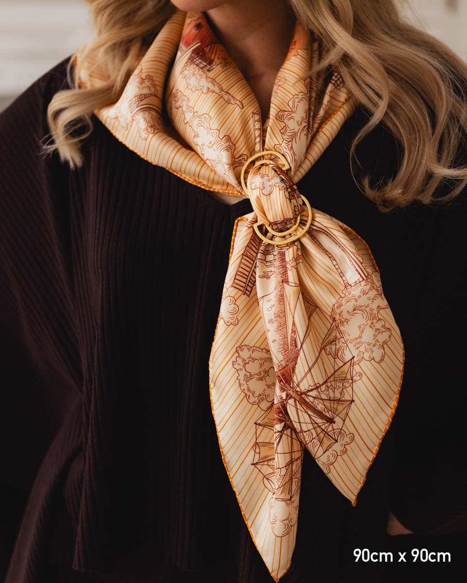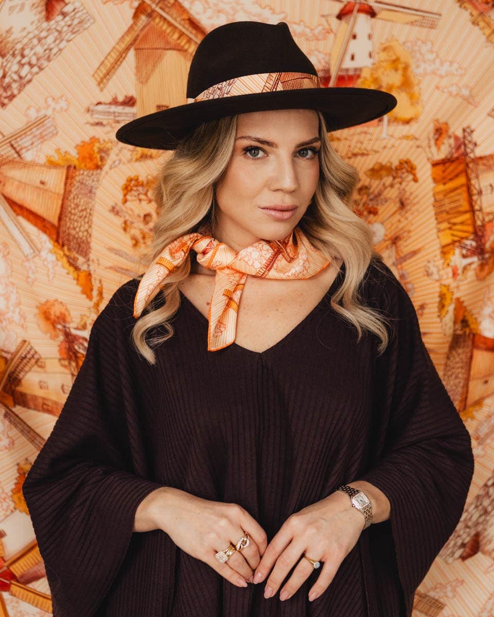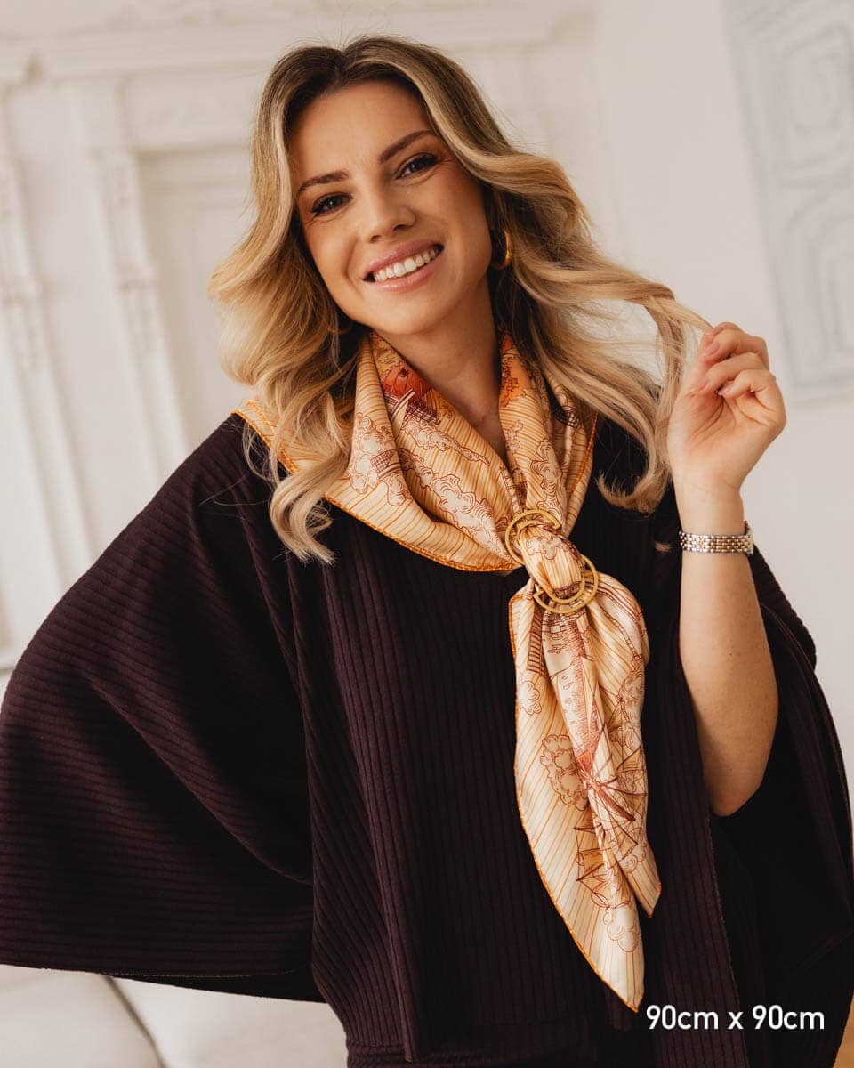 On this scarf, the windmills are accompanied by delicate poppies, subtly forming the outline of Poland - a country where windmills have long ground grain, providing bread and prosperity. In folk culture, they symbolized harmony, marital bonds, and the return of youth - because just as the wind sets them in motion time and again, so too does life continue, renewing its rhythm. By wearing this scarf, you wrap yourself in a tale of strength, perseverance, and the wind that carries tradition into the future.