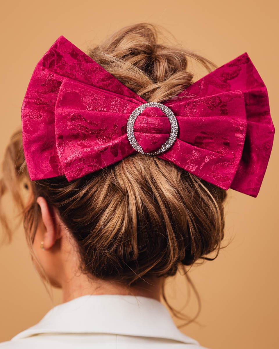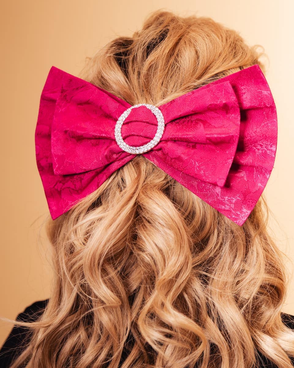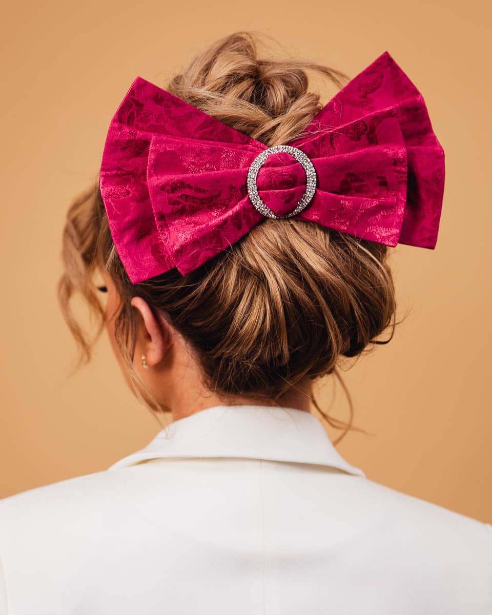 Lukso – the fuchsia jacquard bow will catch everyone’s attention around you. Handcrafted in the Spadiora workshop with the utmost care and attention to detail. It’s a true adornment for your hair, with its distinctive features being its size and the sparkling decorative ring. This clip is for those who value originality and an unconventional style.