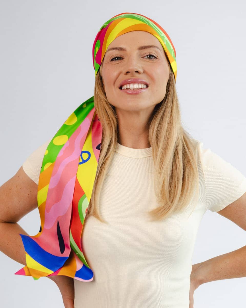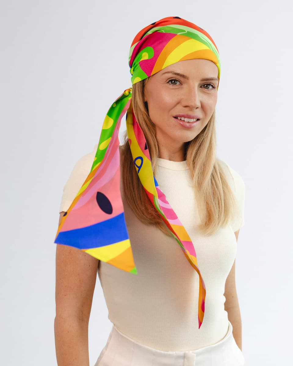 The Silk Head Scarf Corsaro is a perfectly tailored head covering ideal for those seeking quick, easy, and comfortable solutions. Unlike a scarf, you don’t need to know how to tie it. Thanks to the elastic sewn at the back, the head scarf stays securely and comfortably on your head. Finished with long sashes, it will make you stand out from the crowd and feel special. It can be worn in several ways: loose or tied in a bow. The head scarf was created with the principle of upcycling in mind—it was made from scarves that did not pass quality control. The longest part of the sash is 60 cm long.