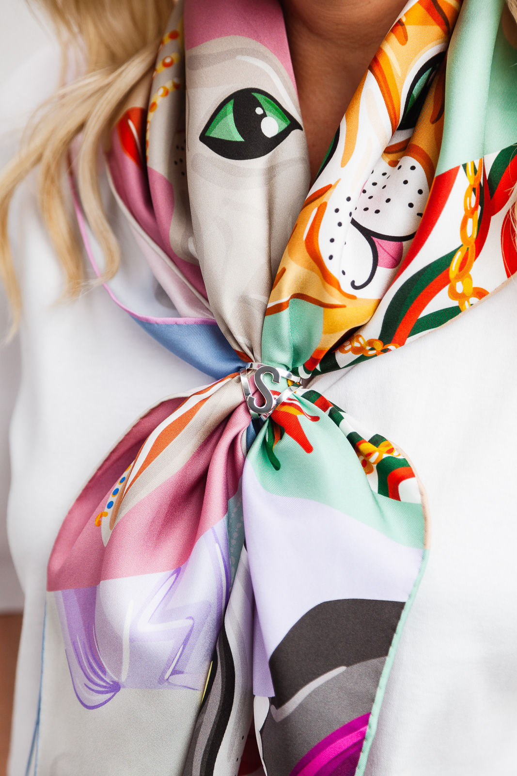 The most universal and the first silver proposition in our collection. Composed of three rings and the letter S. Perfect for scarves in sizes 90x90 and 140x140 cm. Very easy to use, it allows you to tie silk scarves in several different ways.