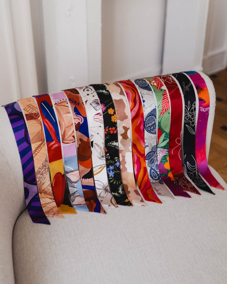 Silk ribbons to choose from in the following designs: "Call It What You Want," "Elements," "Year of the Tiger," "Separation," "Maturity," "Camouflage," "Mazurian Horse" navy blue, and "Mazurian Horse" white.