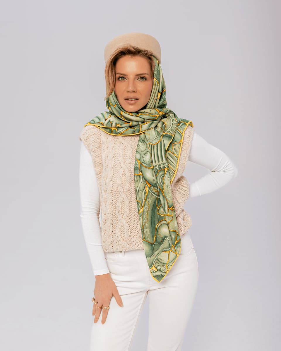 Due to the exclusive and noble nature of the fabric, which is a delicate and subtle blend of silk and wool, the product requires special care. Protect the scarf from sharp edges and elements that may snag the fabric.