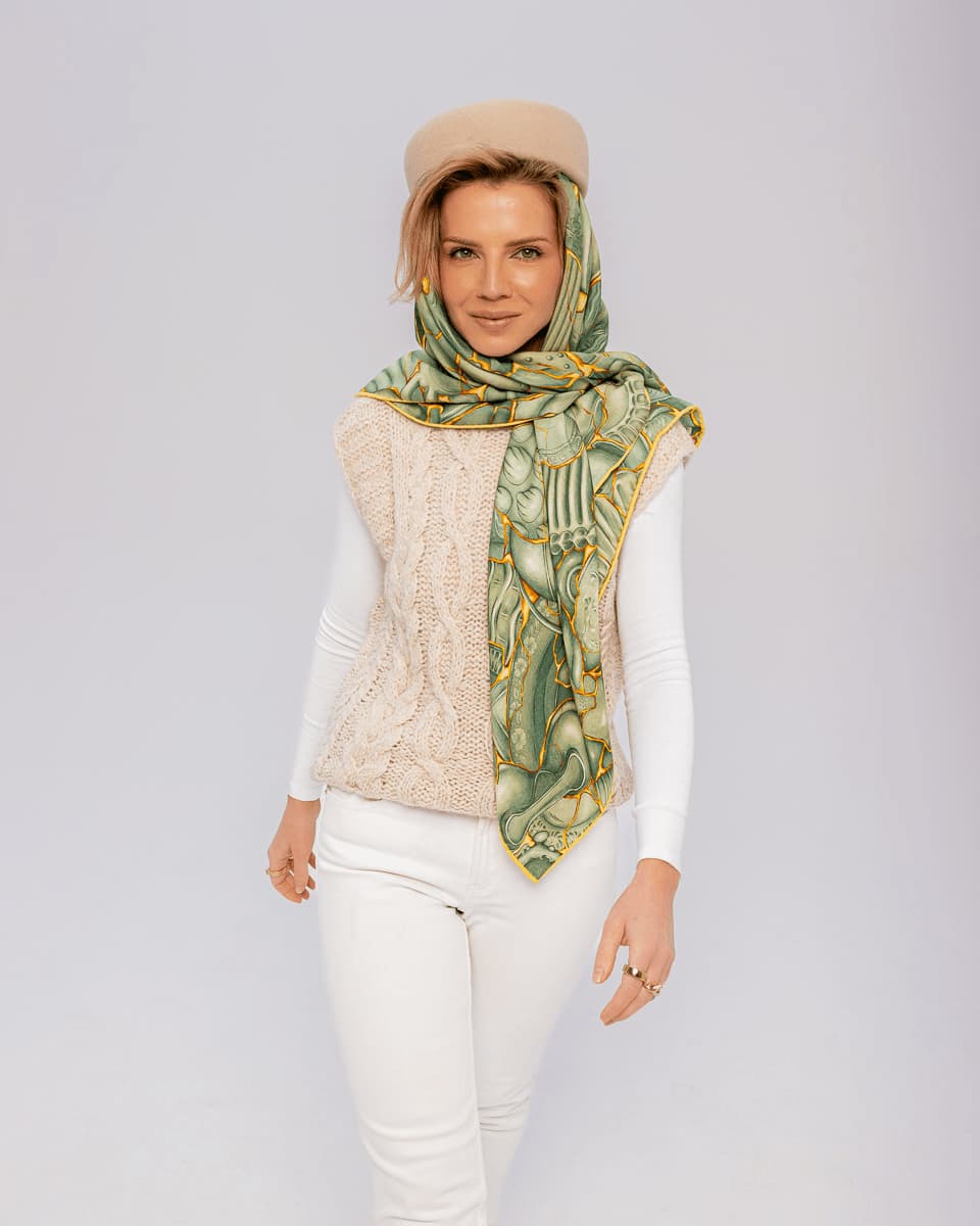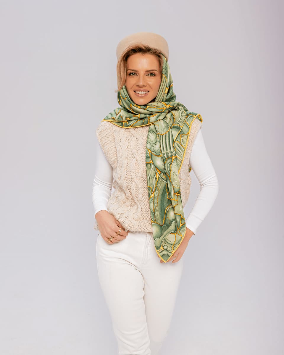 They combine the lightness of silk with the softness and coziness of wool, draping beautifully and wrapping the body naturally. The herringbone weave and hand-rolled edges emphasize their unique character and attention to each and every detail. Created in our iconic patterns, though due to the different fabric composition and weave, the colour intensity may differ slightly from our 100% silk scarves. Perfect for chilly days and summer evenings alike - versatile, stylish, and made to be worn all year round.
