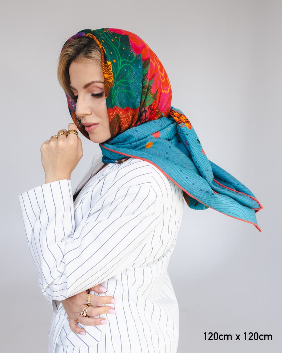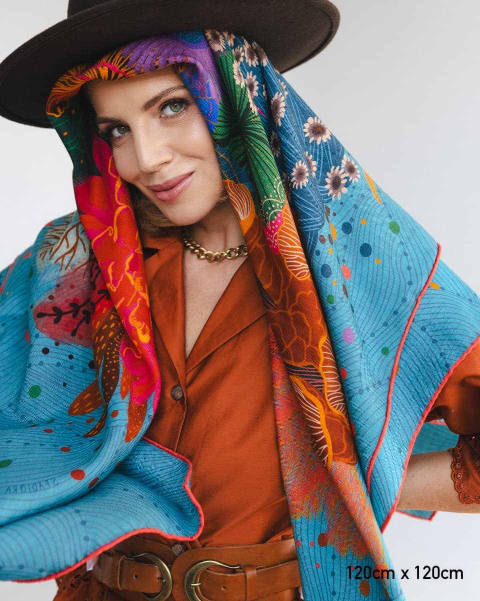 Are you looking at a bouquet of flowers… or at underwater gardens? In this scarf, the boundaries between the known and the unknown blur like waves on the water’s surface.