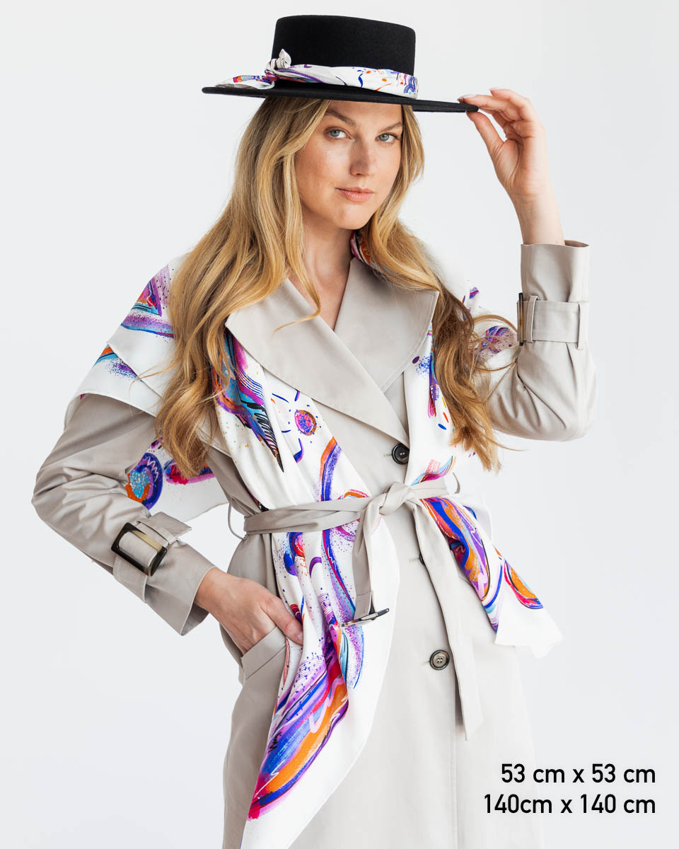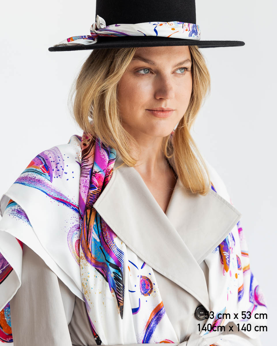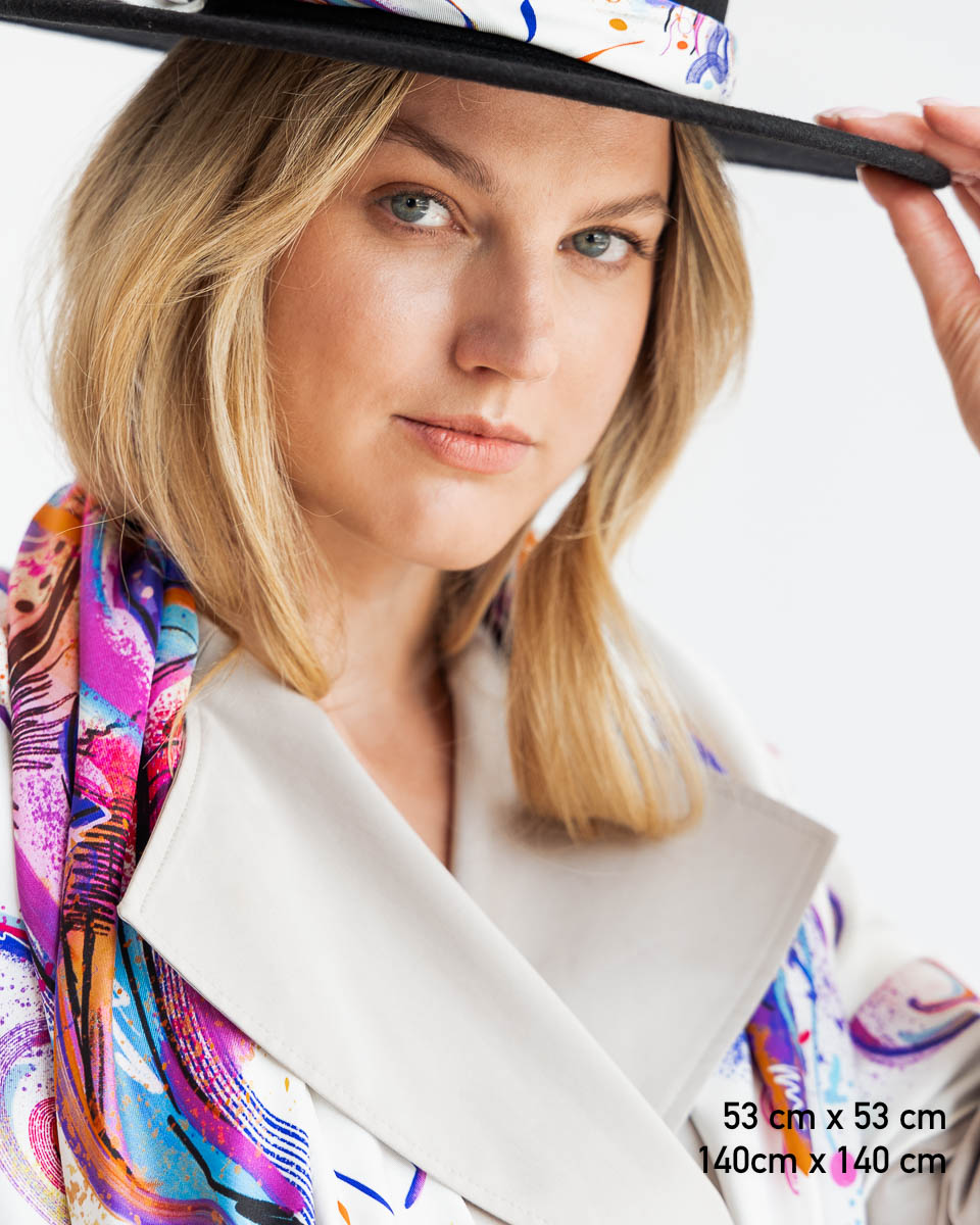 Nasze jedwabne apaszki mają ręcznie rolowane brzegi, dlatego tolerancja każdego wymiaru wynosi do 5%.