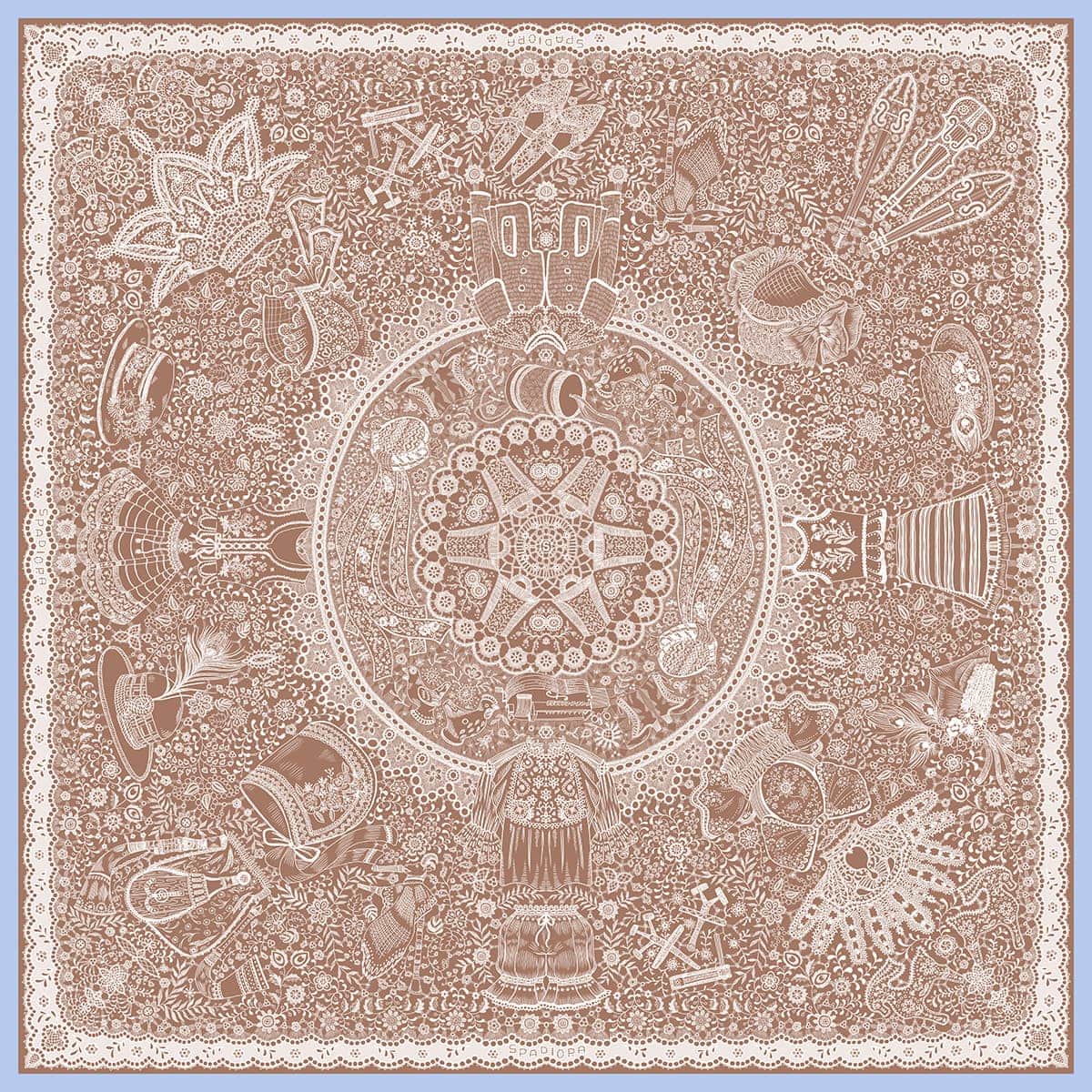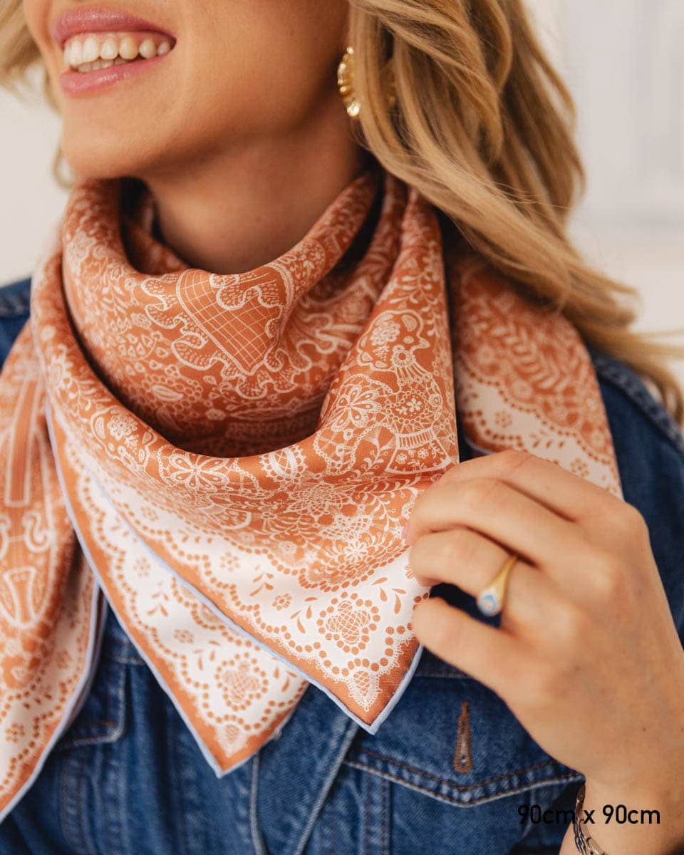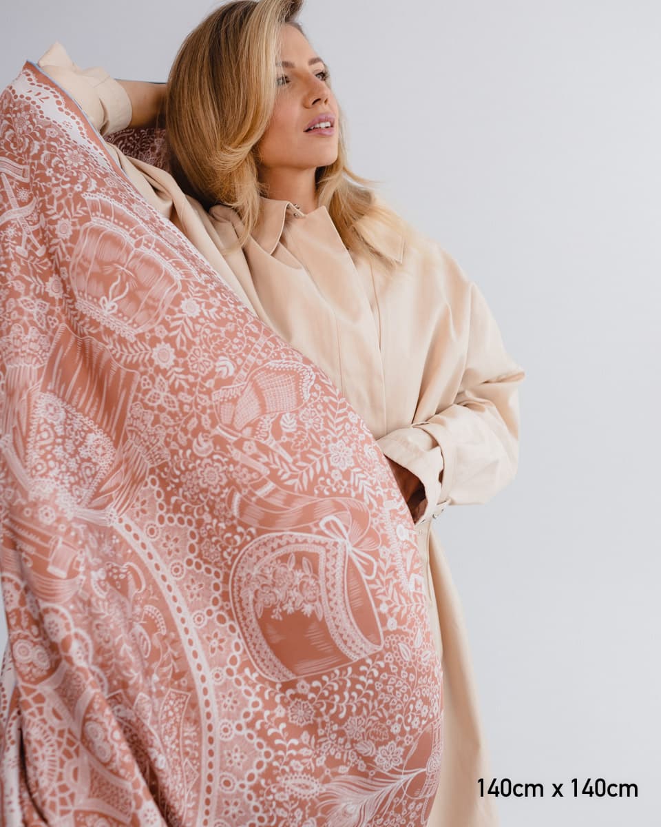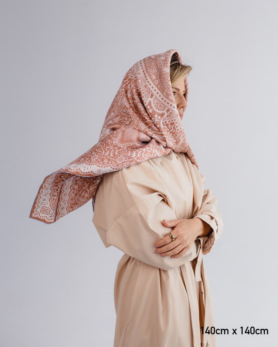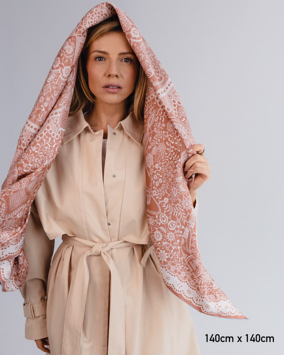 Ta apaszka to hołd dla polskiej sztuki koronki - misternych splotów przekazywanych z pokolenia na pokolenie. Na minimalistycznej apaszce, wykonanej w trzech kolorach, spotykają się wzory z różnych regionów Polski. Wśród koronek ukryte są folkowe symbole: kurpiowskie czółno, dudy, góralskie kierpce czy koronkowe czepce. To subtelna opowieść o bogactwie polskiej tradycji, ukryta w delikatnym detalu. Nosząc ją, niesiesz dalej tę historię.