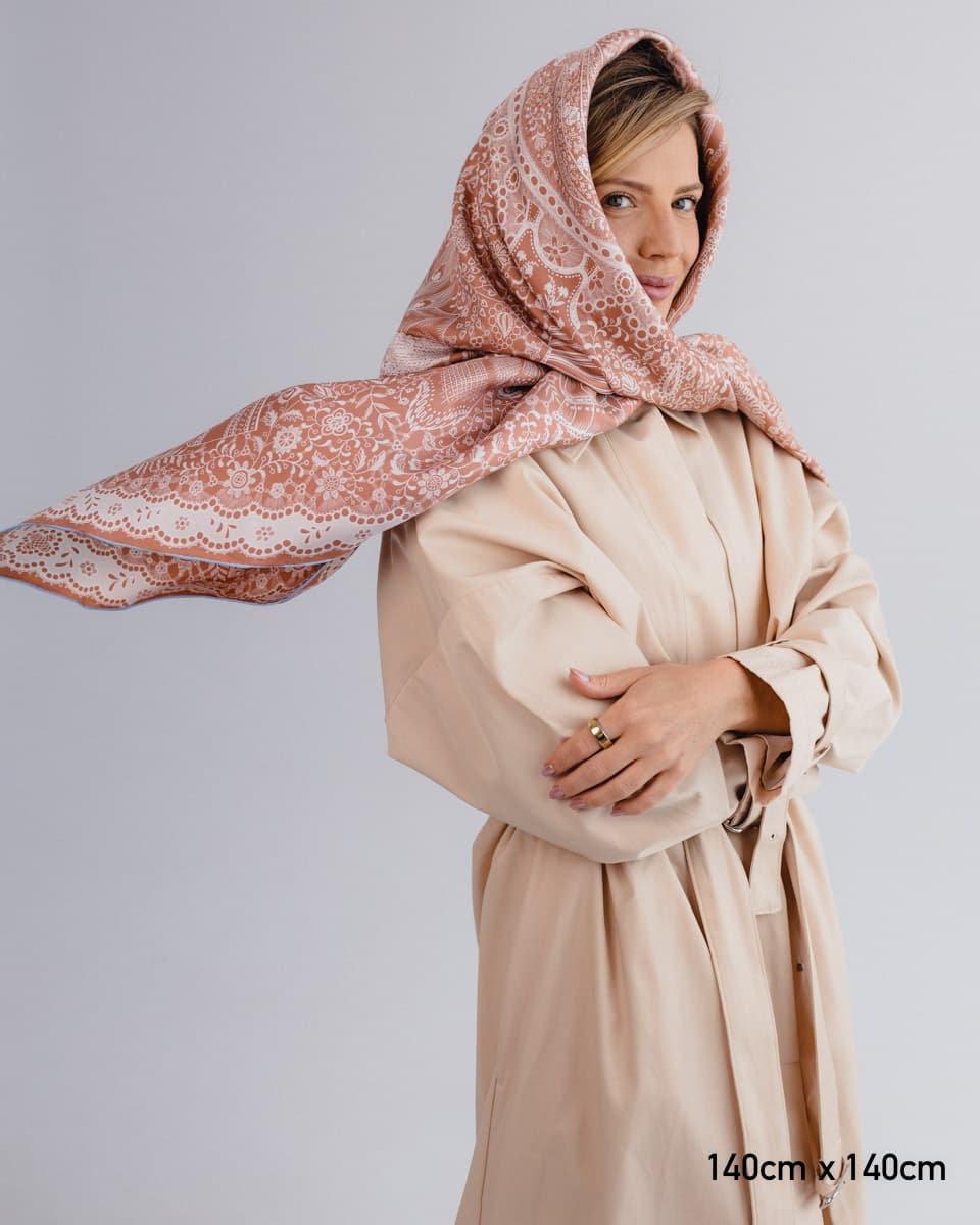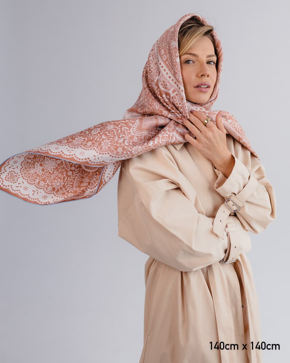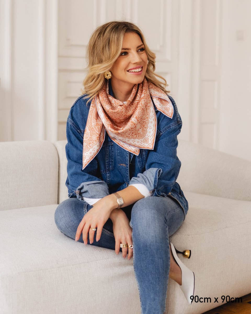 Apaszka utrzymana jest w kolorze roku Pantone 2025 - Mocha Mousse - subtelnym, ciepłym odcieniu brązu, który łączy w sobie elegancję, naturalność i ponadczasowy styl. To wyjątkowy wybór dla osób ceniących modę inspirowaną aktualnymi trendami, ale również poszukujących uniwersalnych dodatków na lata.