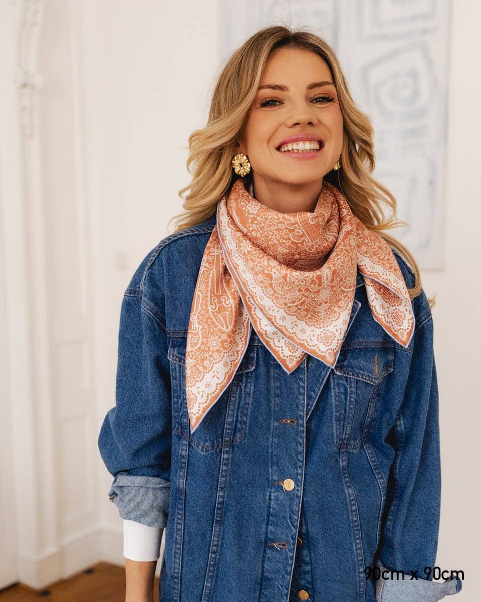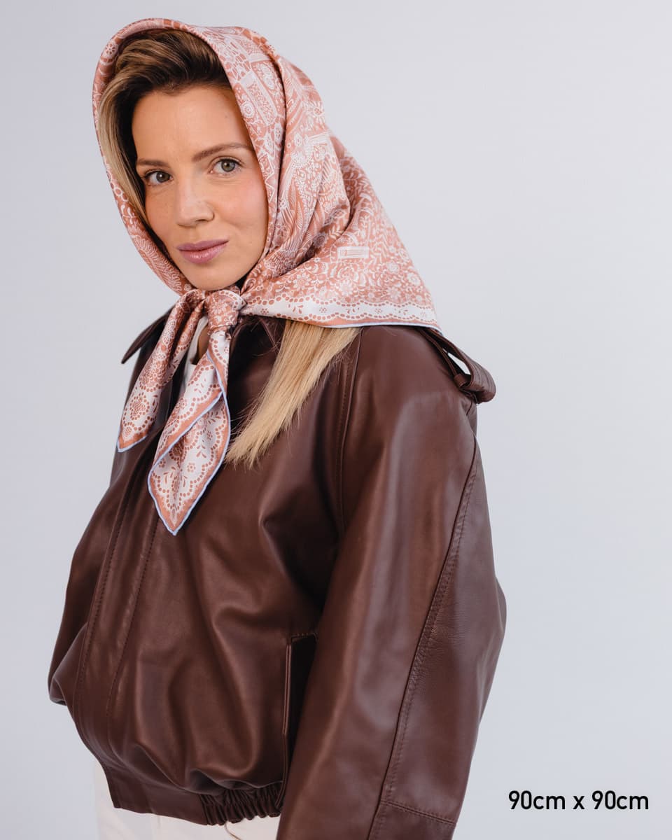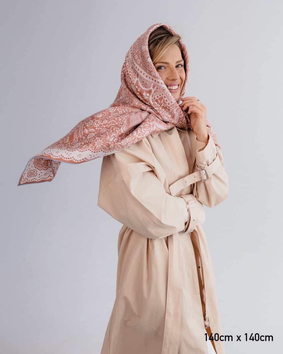 Apaszka utrzymana jest w kolorze roku Pantone 2025 - Mocha Mousse - subtelnym, ciepłym odcieniu brązu, który łączy w sobie elegancję, naturalność i ponadczasowy styl. To wyjątkowy wybór dla osób ceniących modę inspirowaną aktualnymi trendami, ale również poszukujących uniwersalnych dodatków na lata.