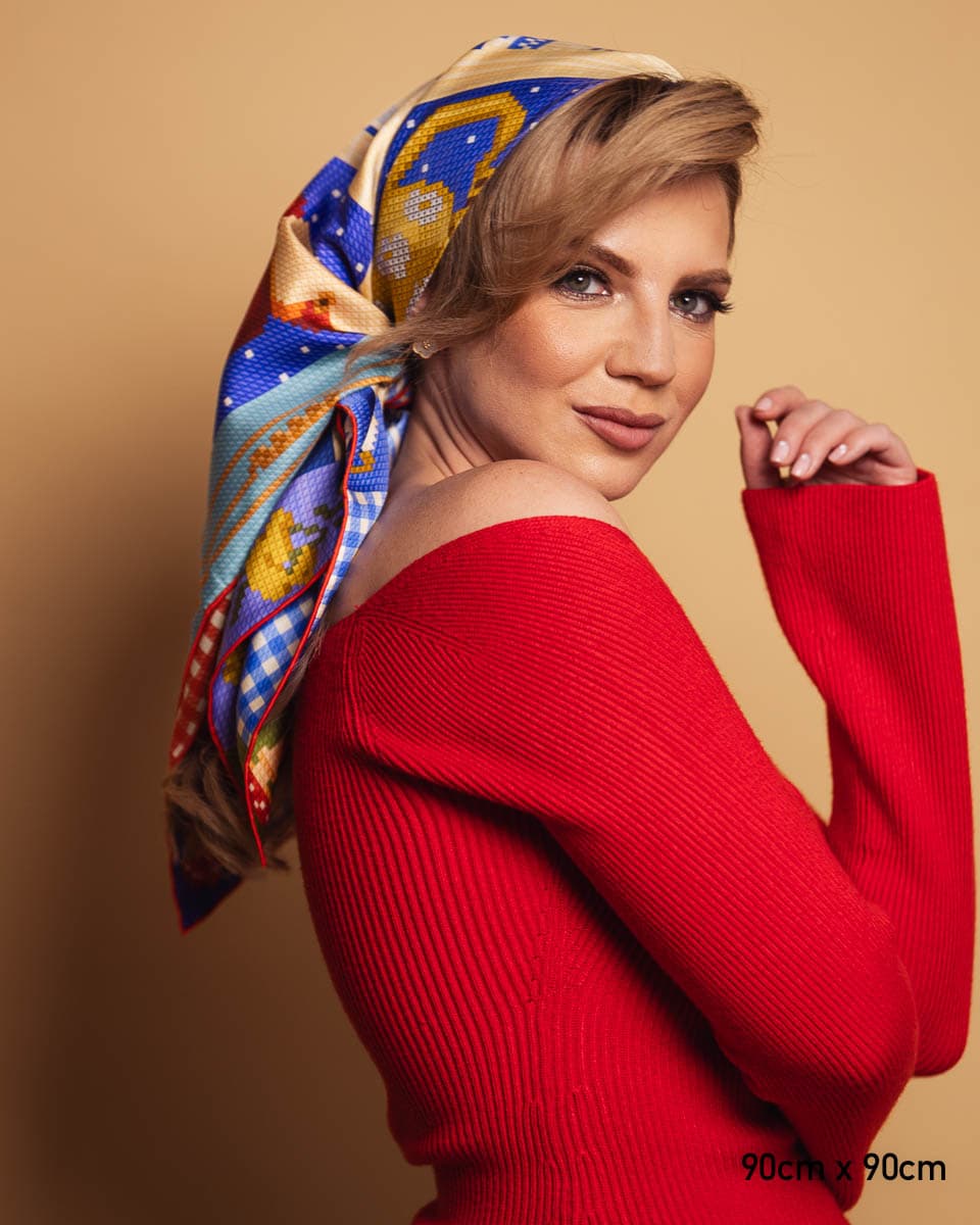 Na tle głębokiego chabrowego błękitu w połączeniu z czerwienią, która przypomina nam barwę ciepłych jesiennych liści, widzimy wspaniałą makatkę, wykonaną w kontrastujących kolorach nawiązujących do polskiego folkloru. Ta tradycyjna polska dekoracja ożywa w charakterystycznym stylu przypominającym haft na tamborku. Makatka ta przypomina nam o pięknie polskiej jesieni i bogatej tradycji, która nadal jest źródłem inspiracji i dumy. To prawdziwe dzieło sztuki, które przenosi nas do serca polskiej wsi i tradycji, ukazując jej piękno w wyjątkowy sposób.