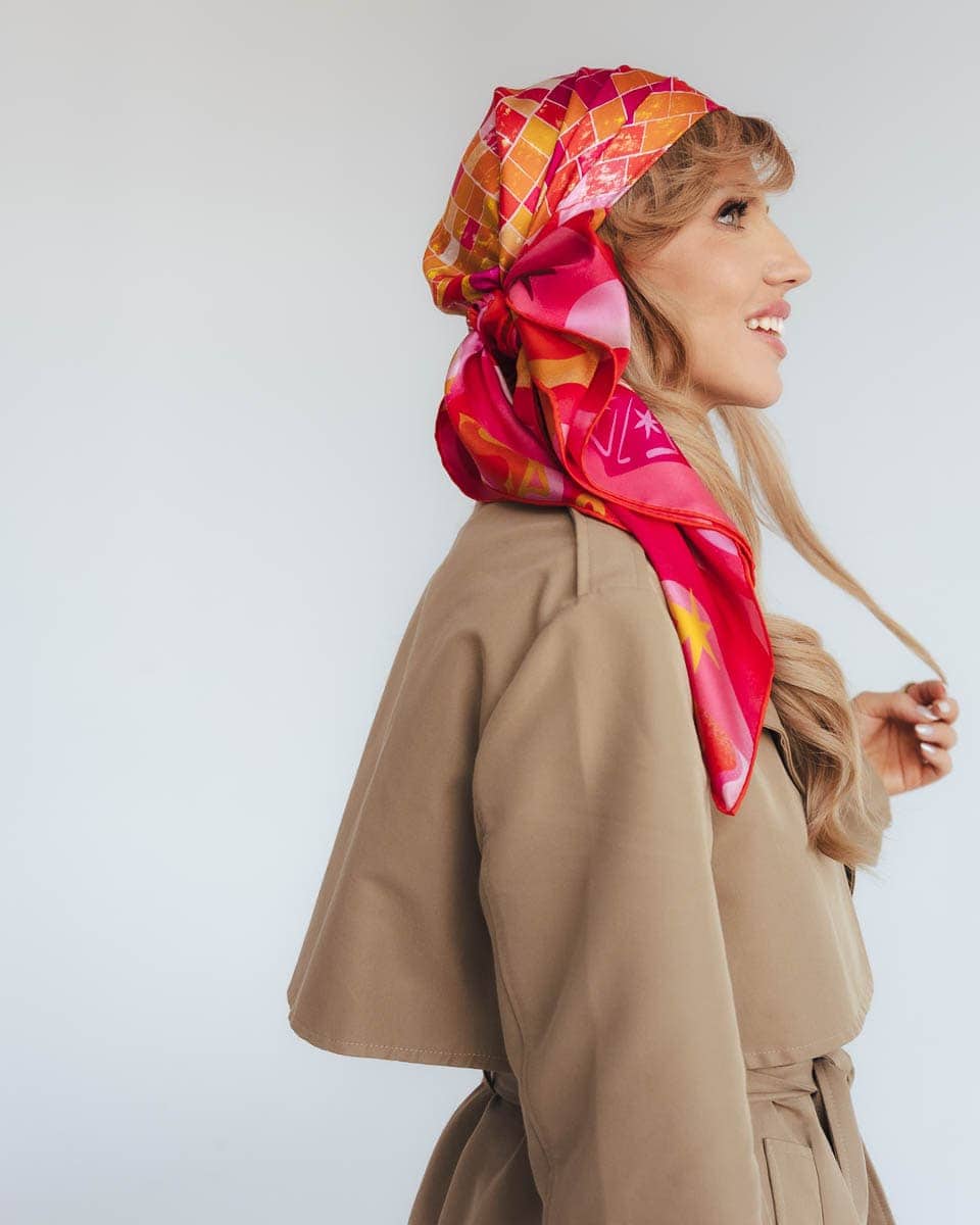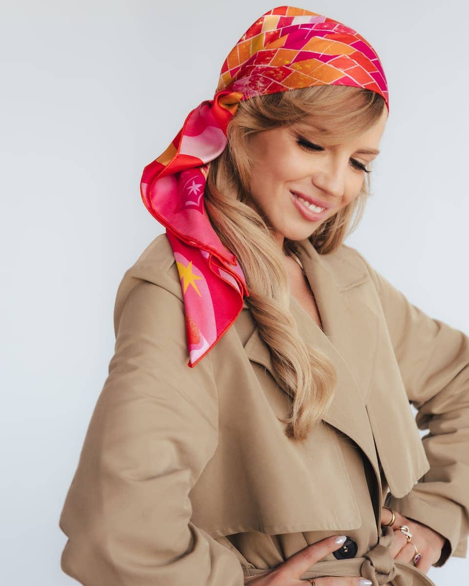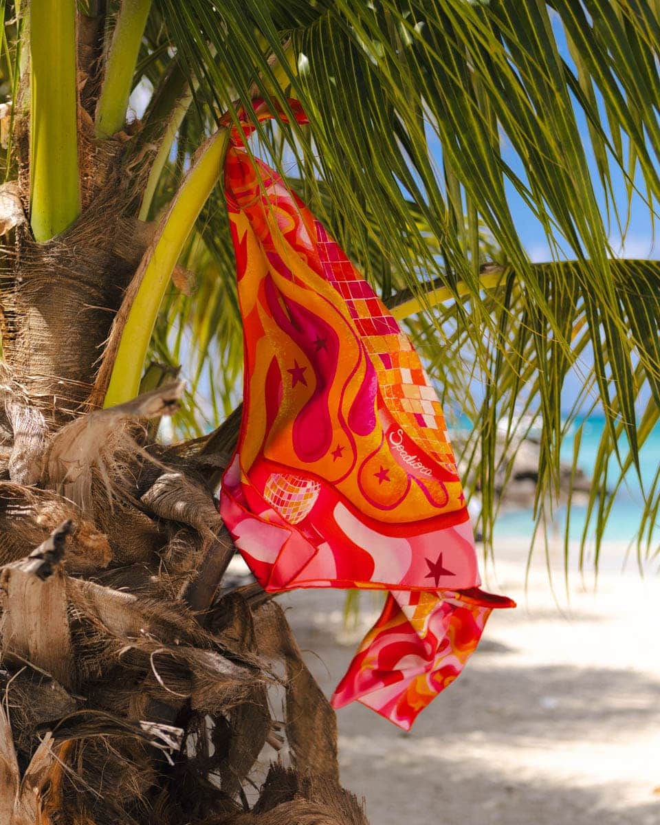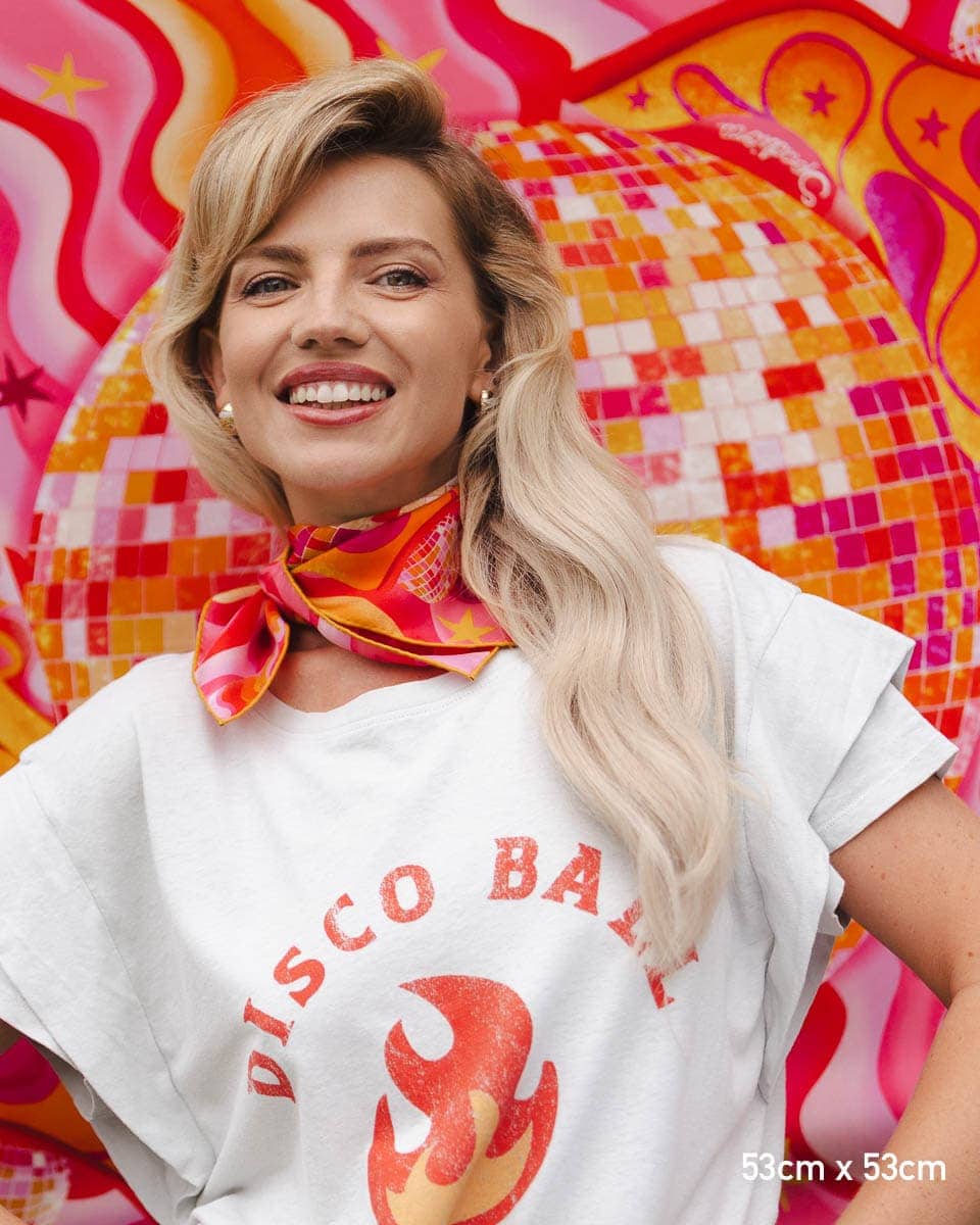 Ta apaszka to jeden z wzorów powstałych w ramach kolekcji „Przyjemności”, która niczym kula dyskotekowa kręci się wokół hedonistycznych wartości. To właśnie one dają nam poczucie szczęścia na co dzień. Nie wymagają epickości by bawić, cieszyć i dodawać nam energii. Ten wzór z jednej strony symbolizuje radość, beztroskę i energię życia jaka płynie z tańca. Z drugiej zaś nostalgicznie przypomina o czasach swojej świetności wywołując romantyczne wspomnienia i sentyment. Zaś w kontekście imprezy tanecznej kula dyskotekowa symbolizuje wspólne doświadczenie i zjednoczenie ludzi poprzez muzykę i taniec.