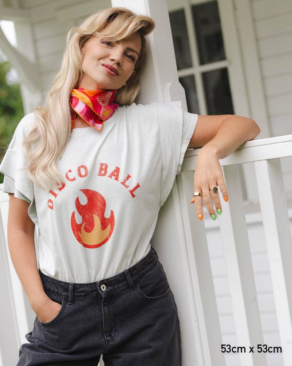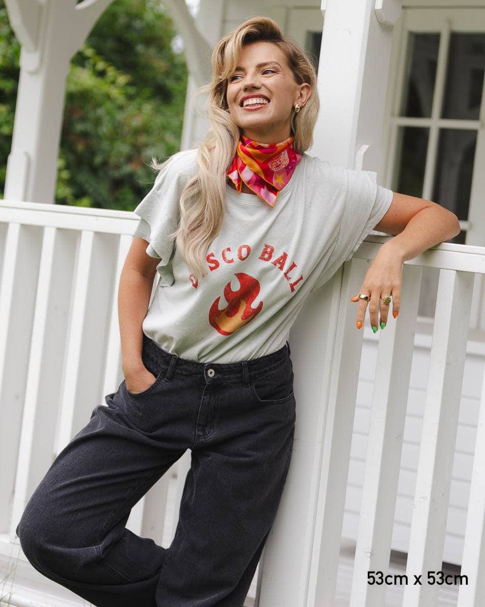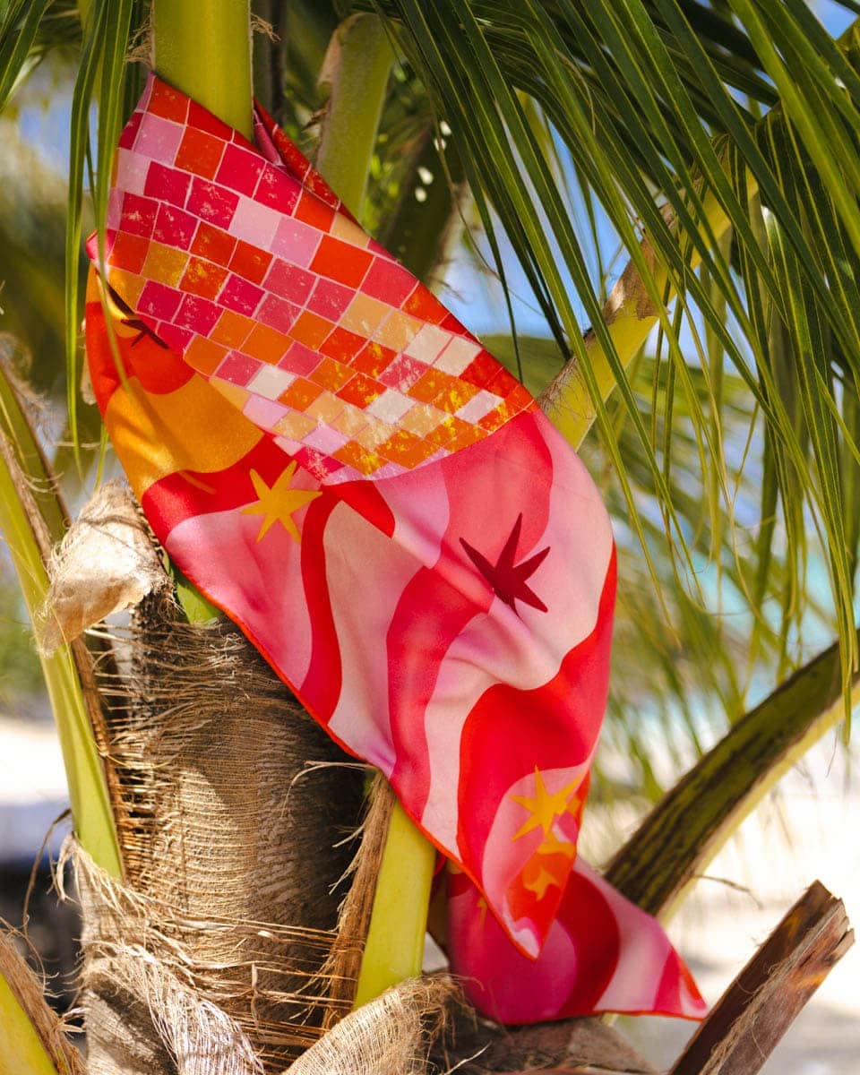 Ta apaszka to jeden z wzorów powstałych w ramach kolekcji „Przyjemności”, która niczym kula dyskotekowa kręci się wokół hedonistycznych wartości. To właśnie one dają nam poczucie szczęścia na co dzień. Nie wymagają epickości by bawić, cieszyć i dodawać nam energii. Ten wzór z jednej strony symbolizuje radość, beztroskę i energię życia jaka płynie z tańca. Z drugiej zaś nostalgicznie przypomina o czasach swojej świetności wywołując romantyczne wspomnienia i sentyment. Zaś w kontekście imprezy tanecznej kula dyskotekowa symbolizuje wspólne doświadczenie i zjednoczenie ludzi poprzez muzykę i taniec.