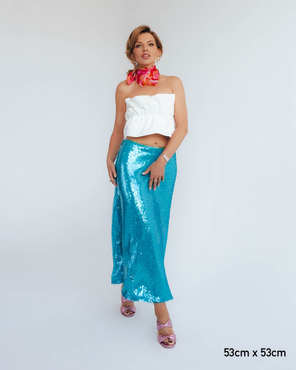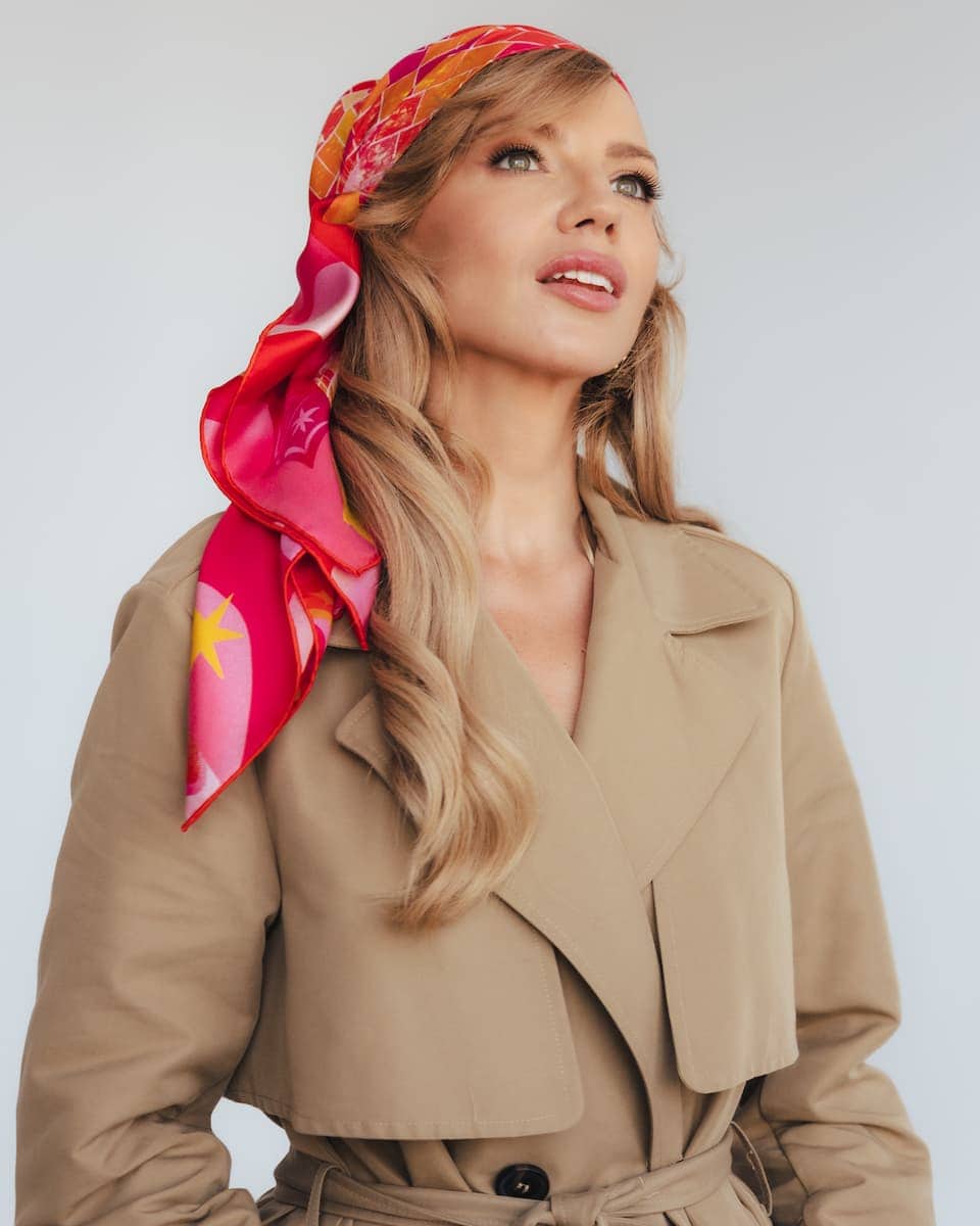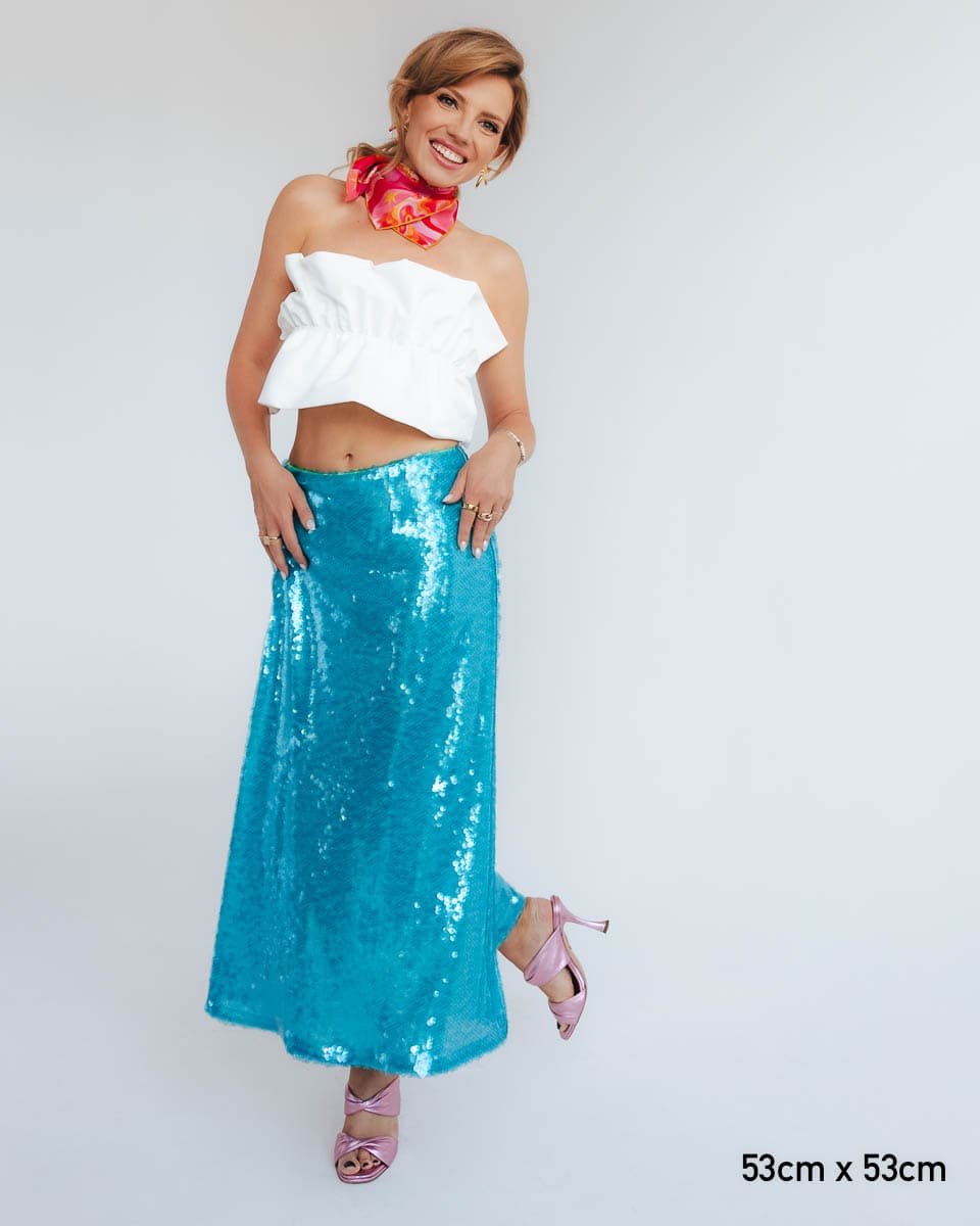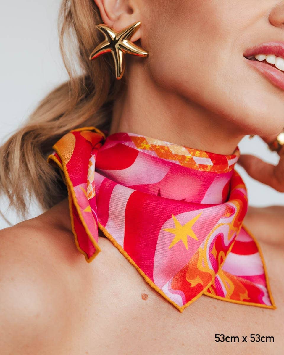 Ta apaszka to jeden z wzorów powstałych w ramach kolekcji „Przyjemności”, która niczym kula dyskotekowa kręci się wokół hedonistycznych wartości. To właśnie one dają nam poczucie szczęścia na co dzień. Nie wymagają epickości by bawić, cieszyć i dodawać nam energii. Ten wzór z jednej strony symbolizuje radość, beztroskę i energię życia jaka płynie z tańca. Z drugiej zaś nostalgicznie przypomina o czasach swojej świetności wywołując romantyczne wspomnienia i sentyment. Zaś w kontekście imprezy tanecznej kula dyskotekowa symbolizuje wspólne doświadczenie i zjednoczenie ludzi poprzez muzykę i taniec.