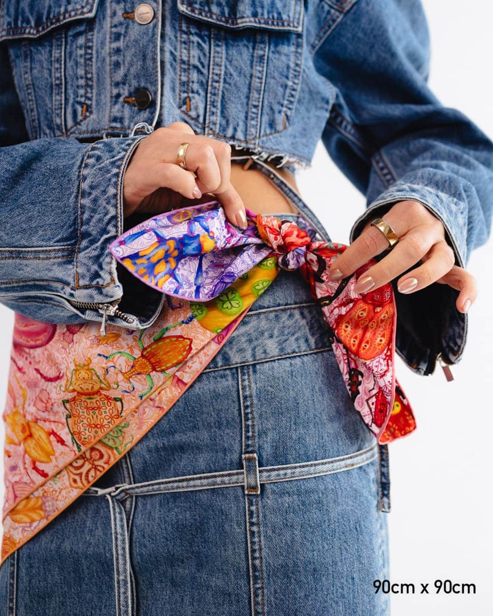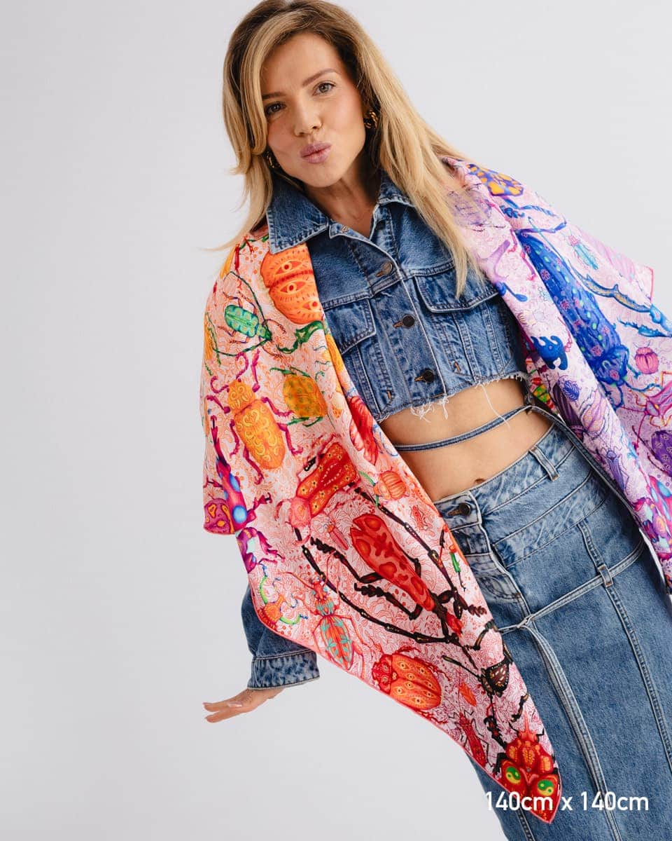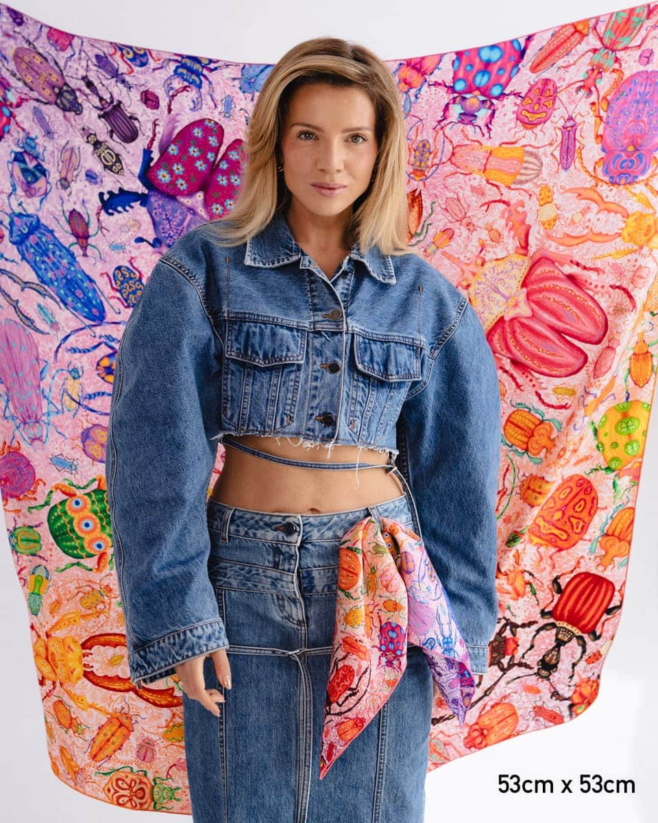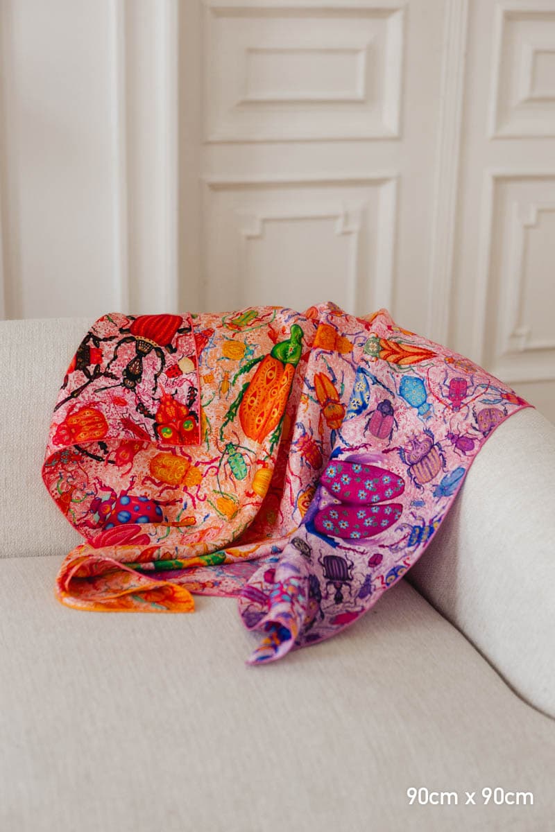 To apaszka o oswajaniu lęków. Kolorowe owady, drepczące w różnych kierunkach, symbolizują myśli, które czasem rozbiegają się w chaosie.