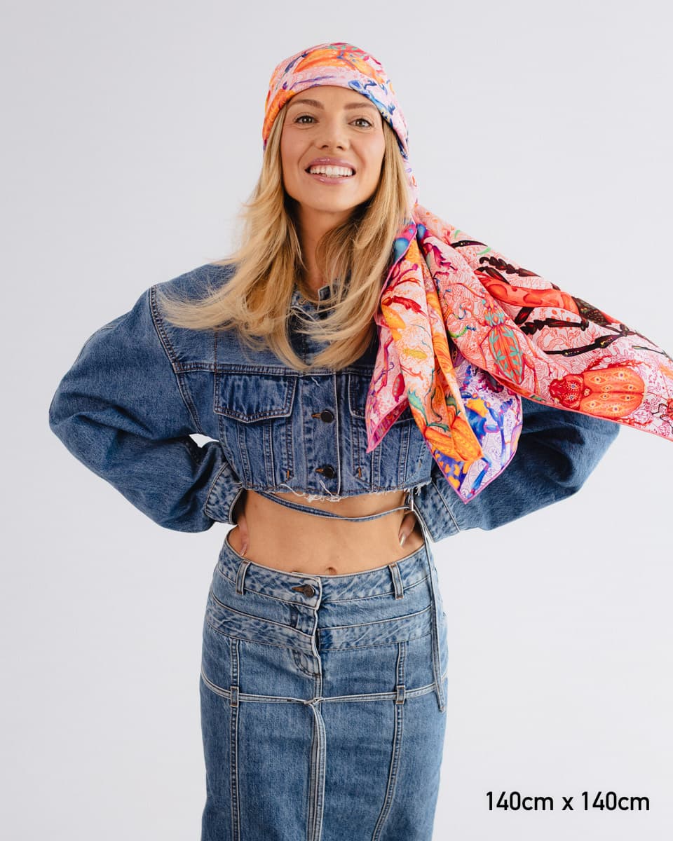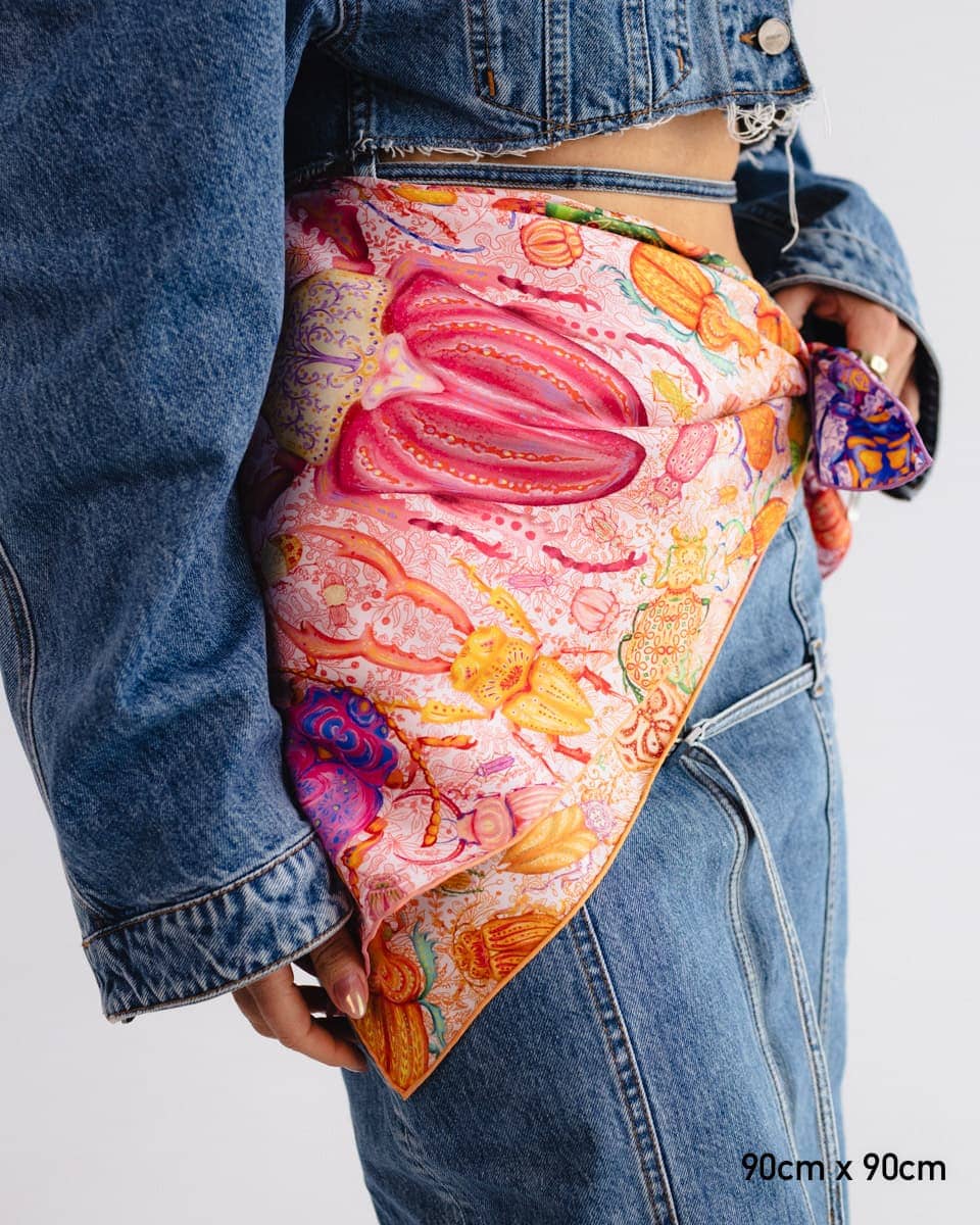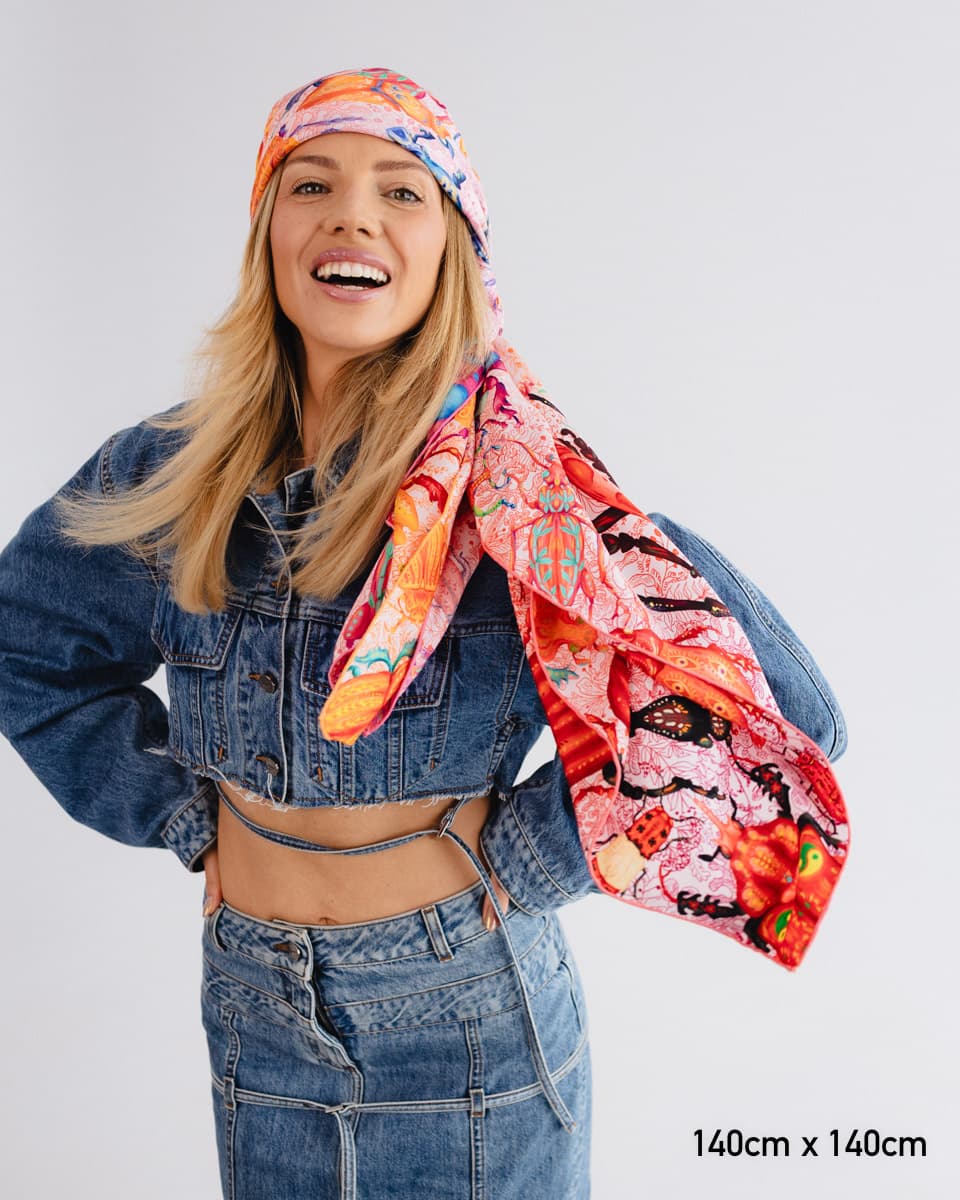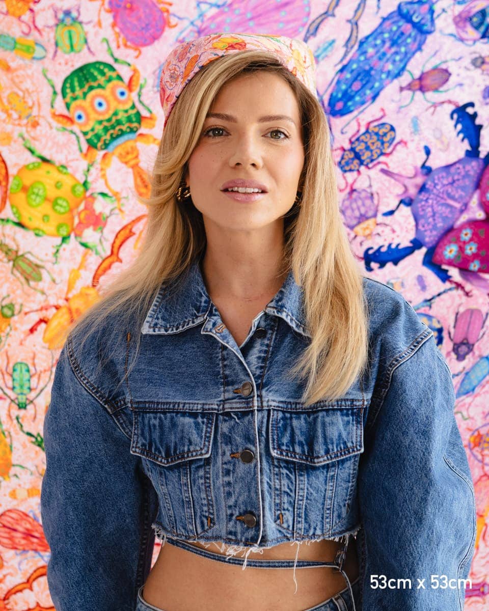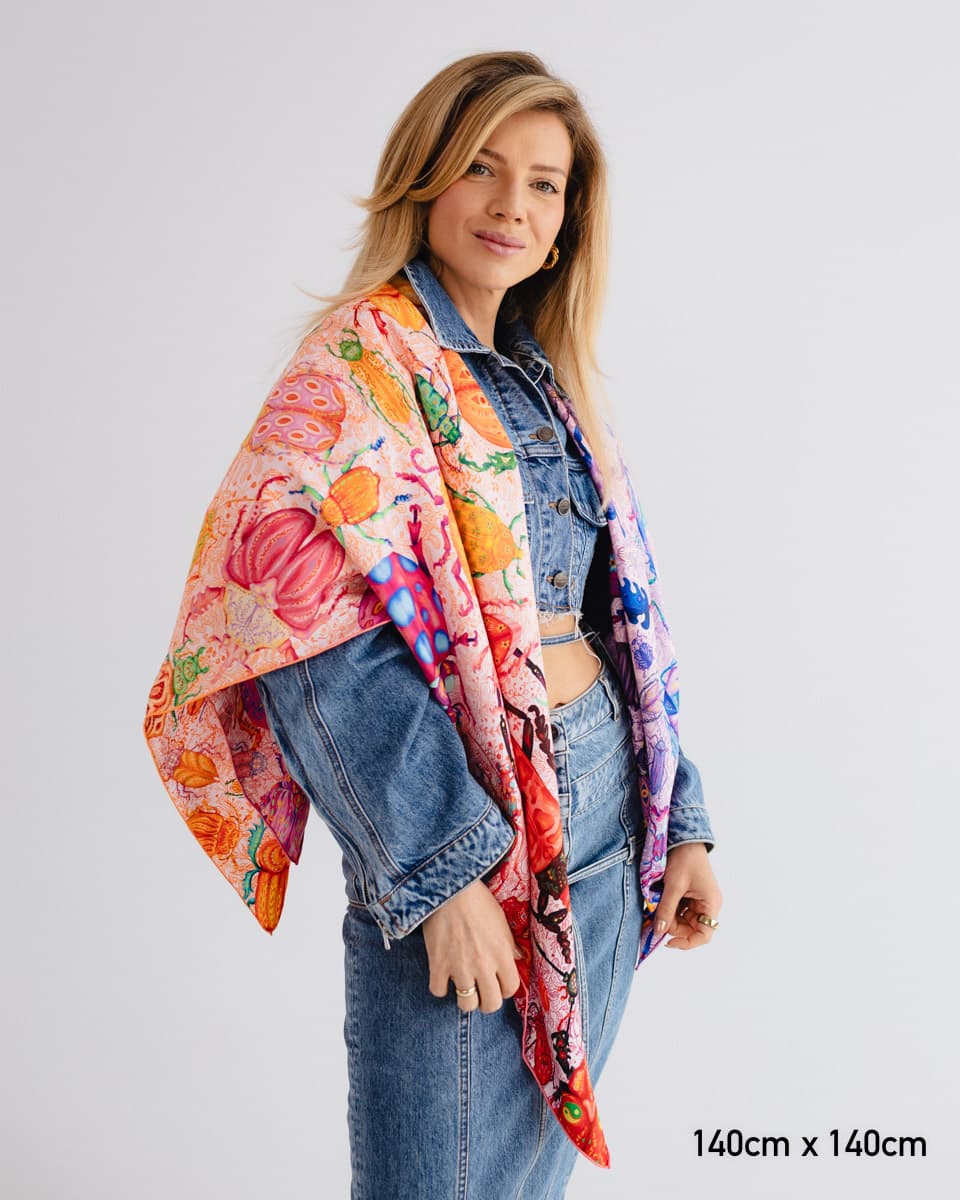 To apaszka o oswajaniu lęków. Kolorowe owady, drepczące w różnych kierunkach, symbolizują myśli, które czasem rozbiegają się w chaosie.