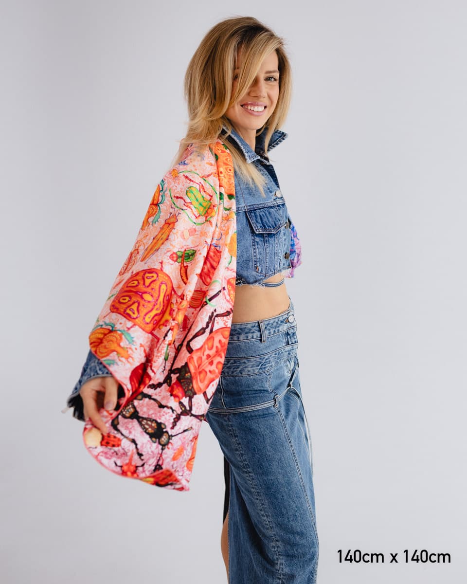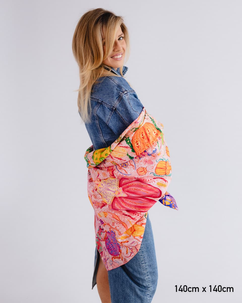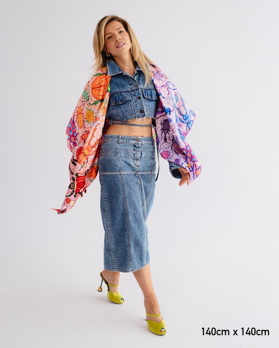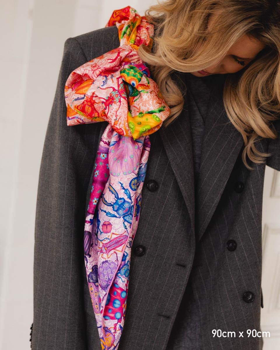 To apaszka o oswajaniu lęków. Kolorowe owady, drepczące w różnych kierunkach, symbolizują myśli, które czasem rozbiegają się w chaosie.