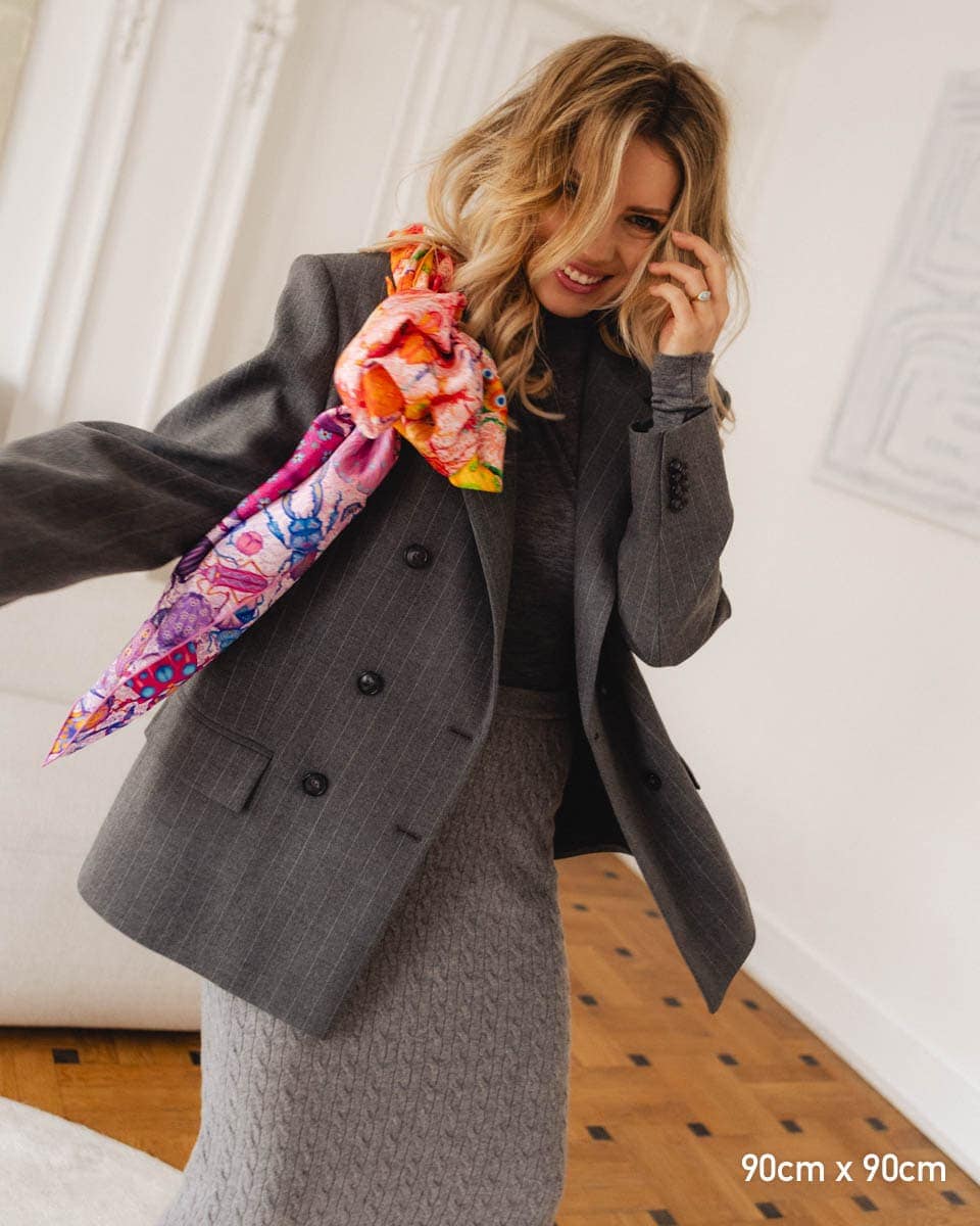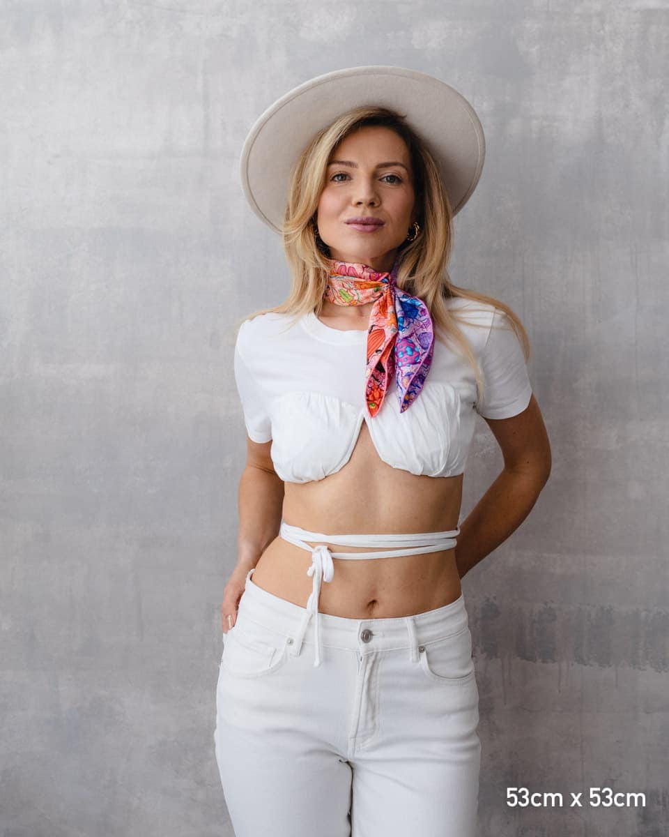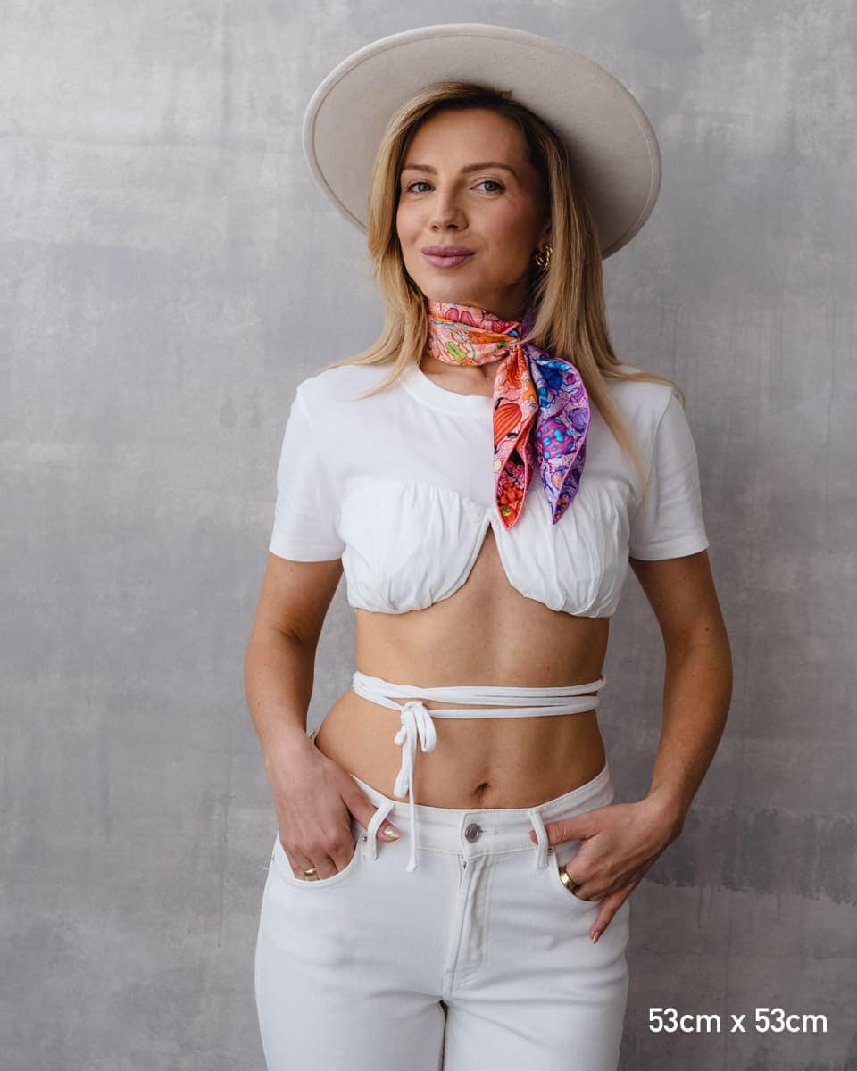 Nasze jedwabne apaszki mają ręcznie rolowane brzegi, dlatego tolerancja każdego wymiaru wynosi do 5%.
