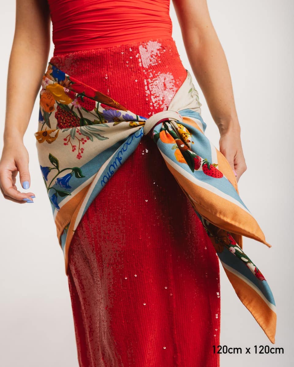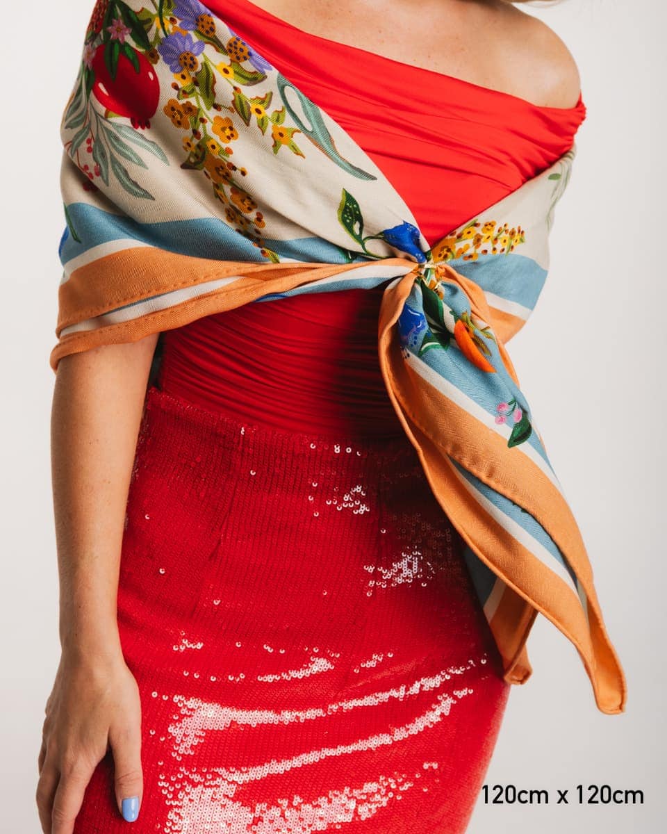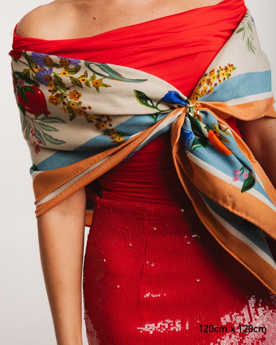 Ten, wydawałoby się na pierwszy rzut oka, klasyczny wzór porusza temat dojrzałości. Bardzo często spychanej na margines. Lubimy patrzeć na to, co piękne, gładkie, młode i powabne. Odwracamy wzrok, kiedy przychodzi nam patrzeć na dojrzałość w czystej naturalistycznej postaci. Często pomarszczonej, wyblakłej, pokrytej patyną, zmęczonej czasem, poranionej życiem. Dlatego, wśród pięknych kwiatów, liści i owoców ukryliśmy te jeszcze piękniejsze: dojrzałe, chcąc pokazać, że noszenie takiej nieidealnej apaszki w dzisiejszych czasach jest pewnego rodzaju odwagą. Chcemy to normalizować i głośno mówić o tym, że dojrzałość jest przepiękna i niesie w sobie zdumiewającą szlachetność.