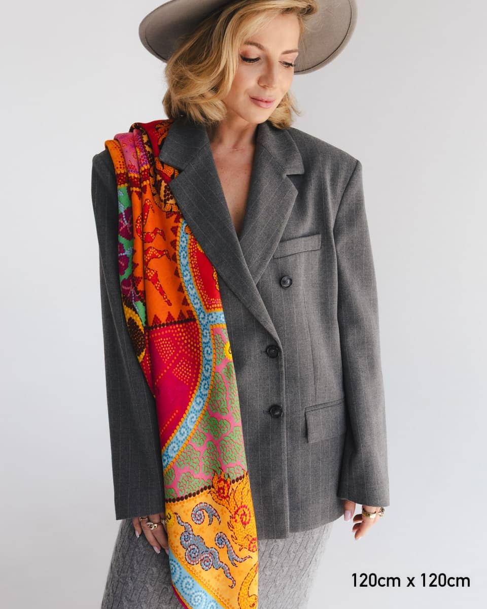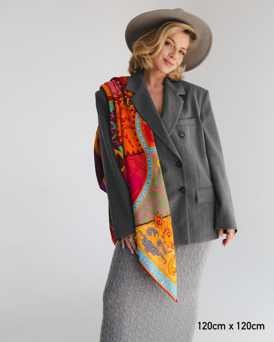 Łączą lekkość jedwabiu z miękkością i otulającym charakterem wełny, dzięki czemu pięknie się układają i naturalnie otulają sylwetkę. Splot jodełkowy oraz ręcznie rolowane brzegi podkreślają ich wyjątkowy charakter i dbałość o detale. Powstały w naszych kultowych wzorach, jednak z racji na inny skład i splot, nasycenie kolorów może różnić się od apaszek w 100% jedwabnych. Idealne zarówno na chłodne dni, jak i letnie wieczory – uniwersalne, stylowe, stworzone do noszenia przez cały rok.
