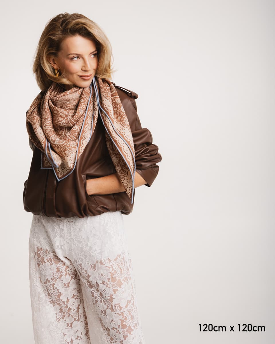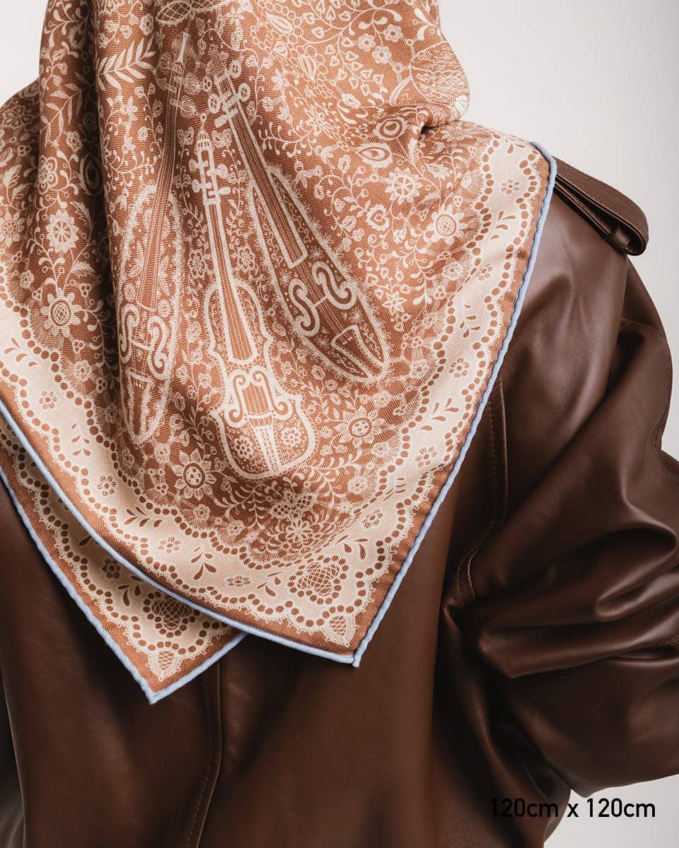Ta apaszka to hołd dla polskiej sztuki koronki - misternych splotów przekazywanych z pokolenia na pokolenie. Na minimalistycznej apaszce, wykonanej w trzech kolorach, spotykają się wzory z różnych regionów Polski. Wśród koronek ukryte są folkowe symbole: kurpiowskie czółno, dudy, góralskie kierpce czy koronkowe czepce. To subtelna opowieść o bogactwie polskiej tradycji, ukryta w delikatnym detalu. Nosząc ją, niesiesz dalej tę historię.