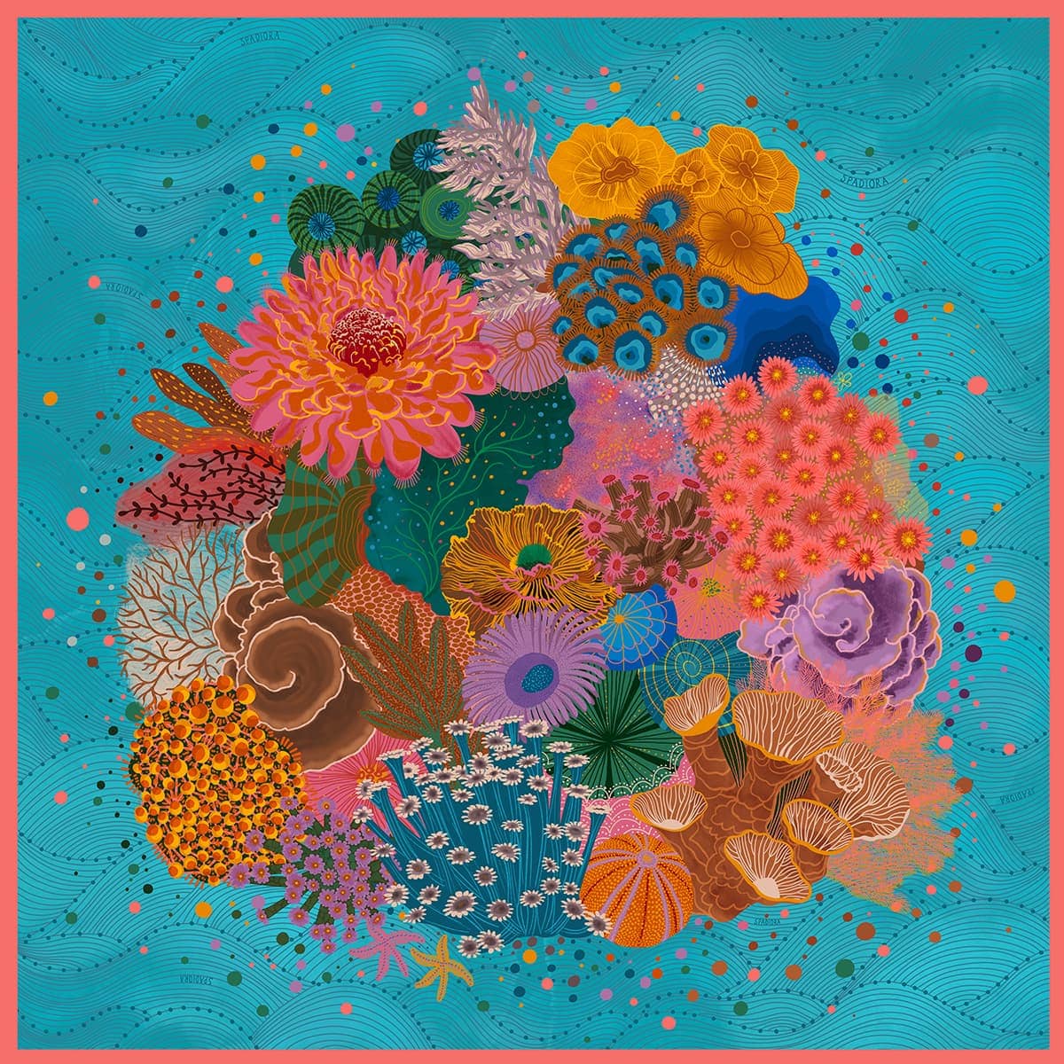 To opowieść o pozorach i o pięknie, które wymyka się jednoznacznej klasyfikacji. O rafach przypominających kwietne łąki, o naturze, która nie potrzebuje ram. Apaszka ta oddaje hołd światu podwodnemu, pełnemu zaskakujących kształtów, bujnych struktur i kolorów, które zachwycają jak najpiękniejsze bukiety.