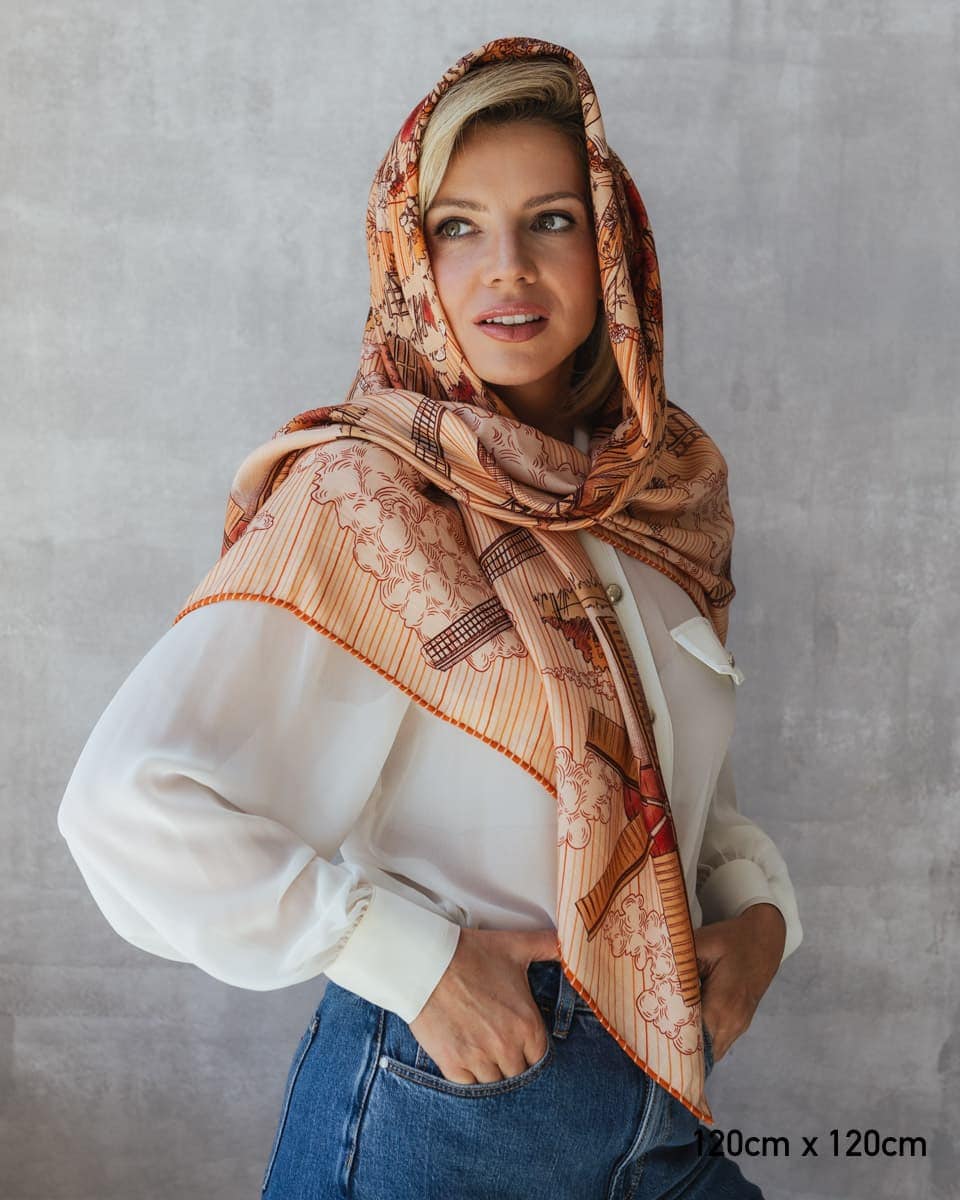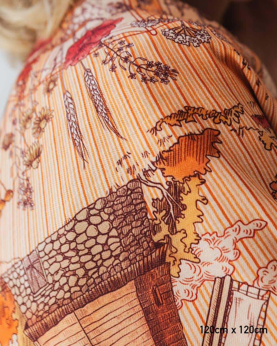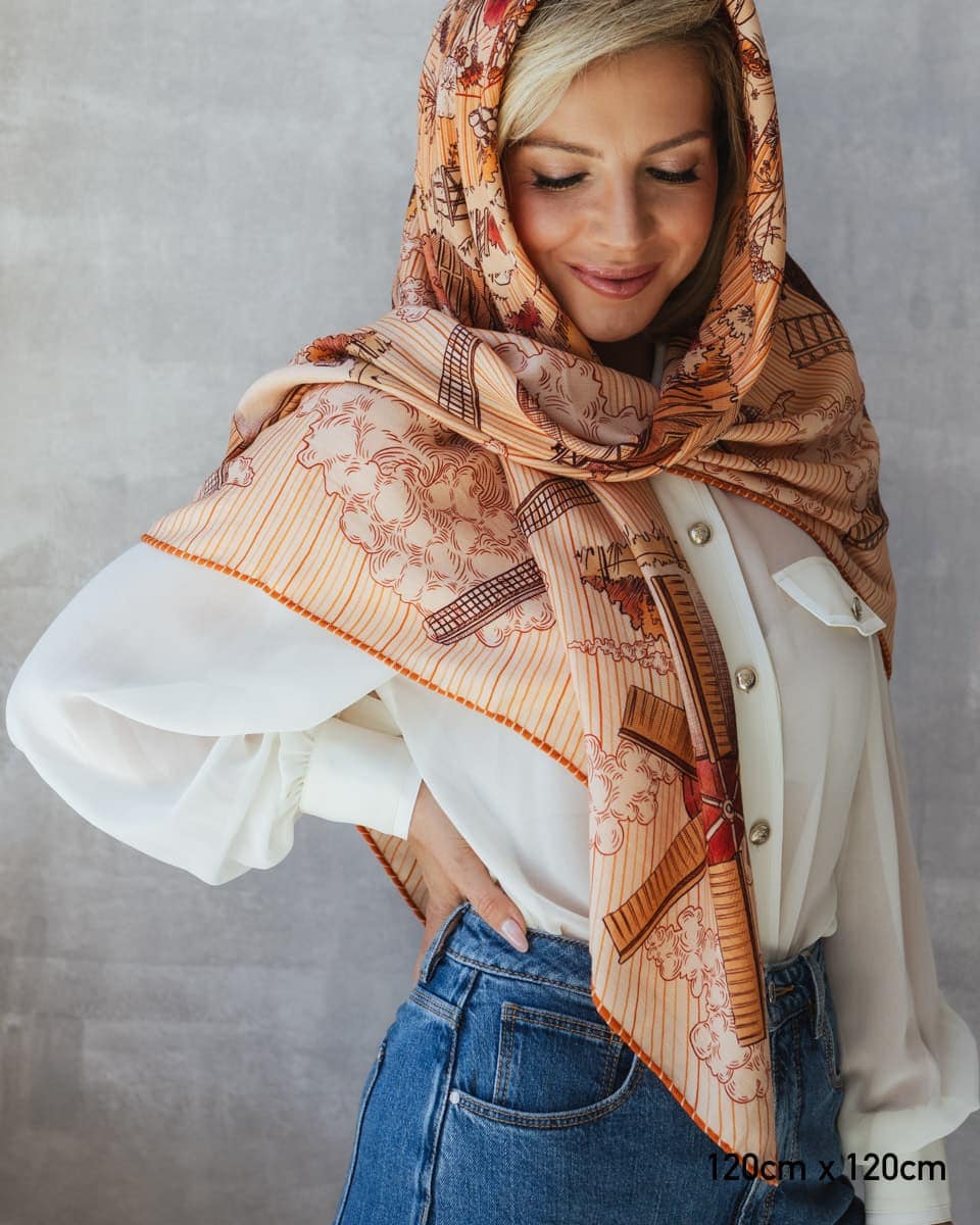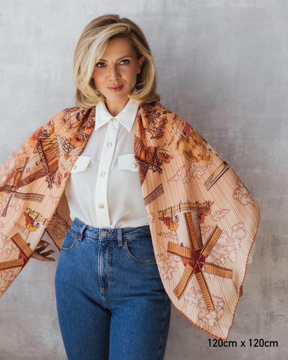 To opowieść utkana w jedwab – symbolika zaklęta w ruchu skrzydeł młynów, które od wieków są pomostem między niebem a ziemią. To hołd dla ludzkiej pomysłowości i siły w ujarzmianiu żywiołów, ale także znak nieustającej pracy i cyklu natury. Na apaszce młynom towarzyszą kwiaty maku, które subtelnie układają się w kontur Polski – kraju, w którym wiatraki od wieków mieliły zboże, zapewniając chleb i dostatek. W kulturze ludowej symbolizowały one harmonię, małżeńskie przymierze i powracającą młodość – bo, jak wiatr wciąż na nowo wprawia je w ruch, tak i życie toczy się nieprzerwanie, odnawiając swój rytm. Nosząc tę apaszkę, otulasz się opowieścią o sile, pracy i wietrze, który niesie tradycję ku przyszłości.