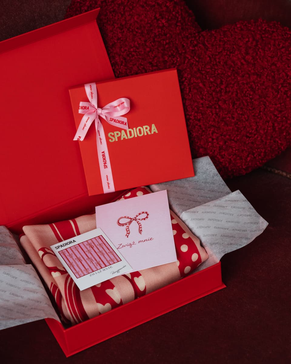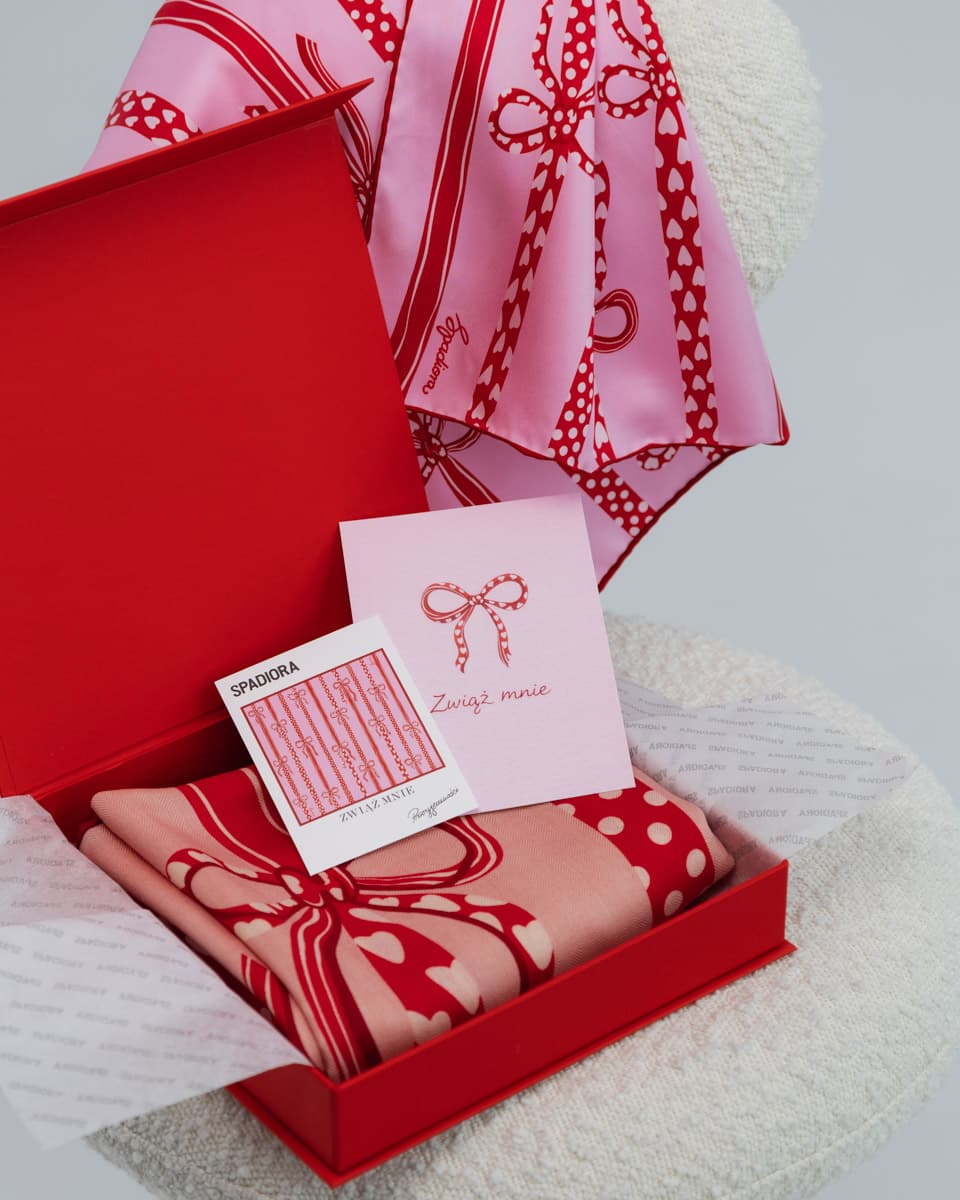 Ta kolekcja powstała jako wyjątkowy moment w historii marki. Limitowany jest nie tylko sam wzór, ale również sposób jego oprawy. Specjalnie dla apaszek, chust i poszetek „Zwiąż mnie” zaprojektowane zostały dedykowane opakowania oraz wstążki, których kolory nawiązują do wzoru. To unikat tworzony tylko na tę okazję, tak jak wyjątkowe są relacje, które zostają z nami na dłużej.