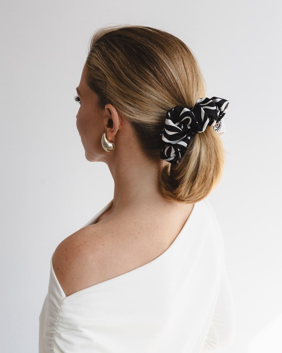 Gumka typu scrunchie z dodatkową jest genialnym dodatkiem do każdego koloru i rodzaju włosów. Duża, mięsista, idealnie podkreśla nawet najprostszą fryzurę. Świetnie trzyma włosy, a dzięki materiałowi, z którego jest wykonana (100% naturalny jedwab) nie wyrywa ani nie uszkadza włosów.