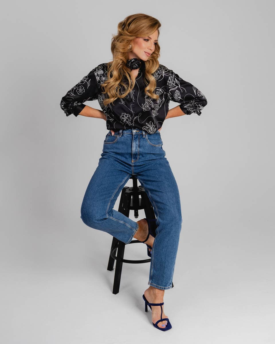 Nasza czarna jedwabna koszula o ponadczasowym kroju łączy elegancję z odrobiną artystycznej swobody. Delikatny, autorski oryginalny wzór nadaje jej unikalnego charakteru, który wyróżni Cię z tłumu. Dzięki uniwersalnemu fasonowi, koszula doskonale sprawdzi się w różnorodnych stylizacjach. Oblekane guziki jedwabiem nadają szyku i elegancji. Załóż ją do eleganckiej spódnicy maxi na wyjątkowe wyjście, zestaw ze spodniami w kant do biura lub postaw na swobodny look z ulubionymi jeansami. Świetnie prezentuje się zarówno pod klasyczną marynarką, jak i w bardziej rockowej odsłonie pod ramoneską. Stwórz zestaw łącząc koszule wraz z jedwabną apaszką lub jedwabną różą w tym samym wzorze.