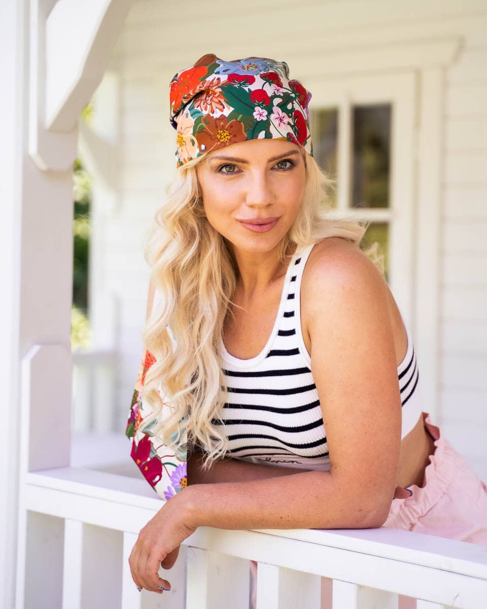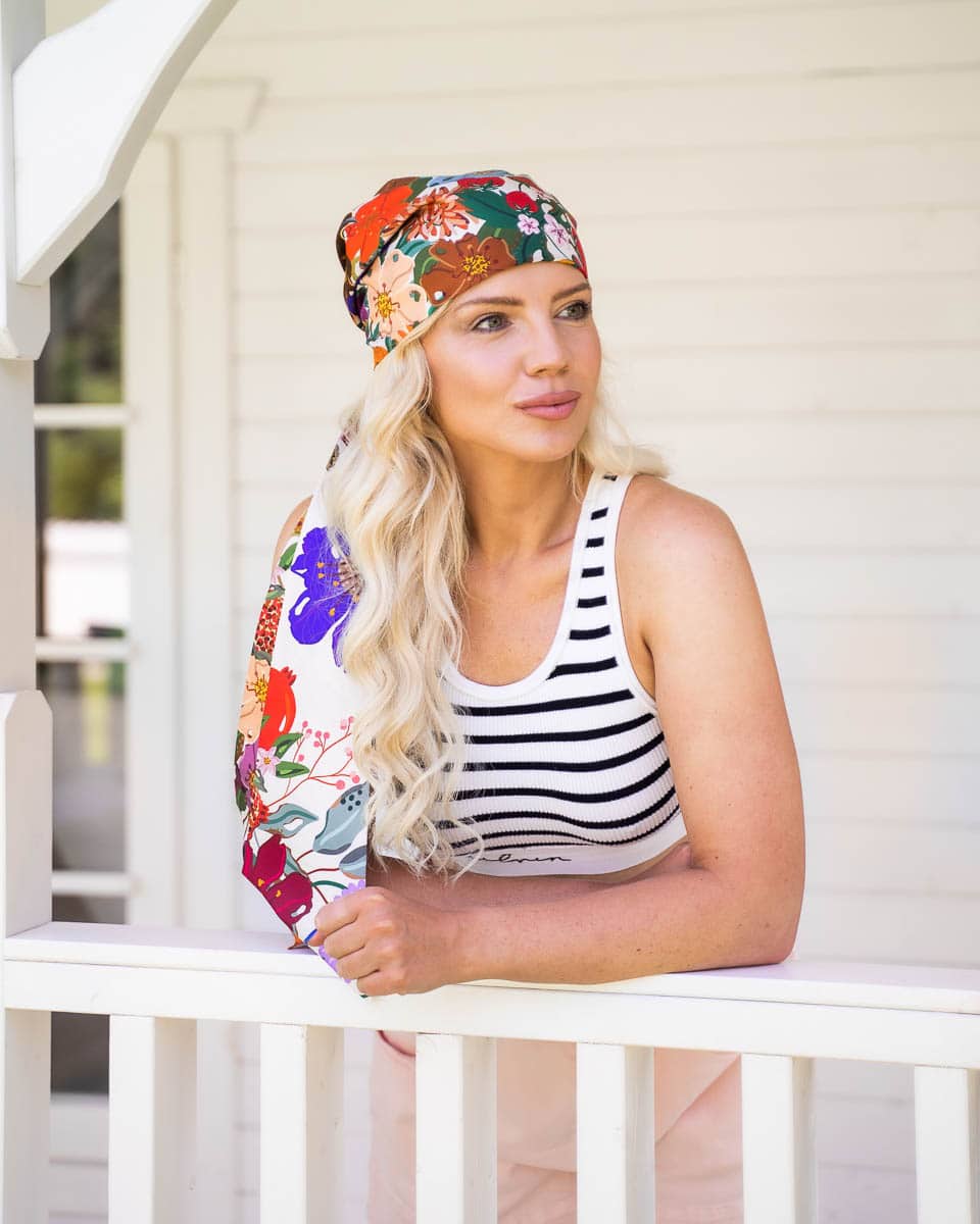 Dzięki gumce wszytej z tylu piratka bardzo stabilnie i komfortowo trzyma się na głowie. Wykończona długimi szarfami sprawi że wyróżnisz się z tłumu i poczujesz się wyjątkowo. Można ją na kilka sposobów: rozwiązaną lub wywiązaną w kokardę.