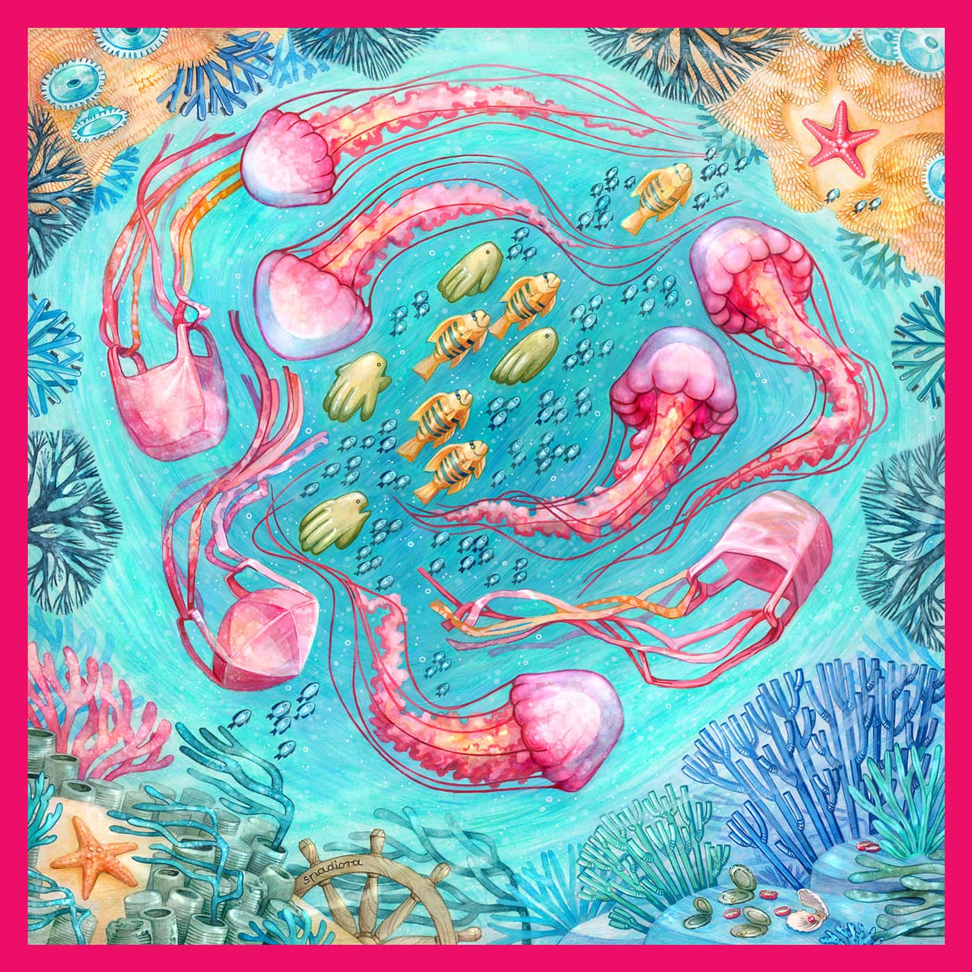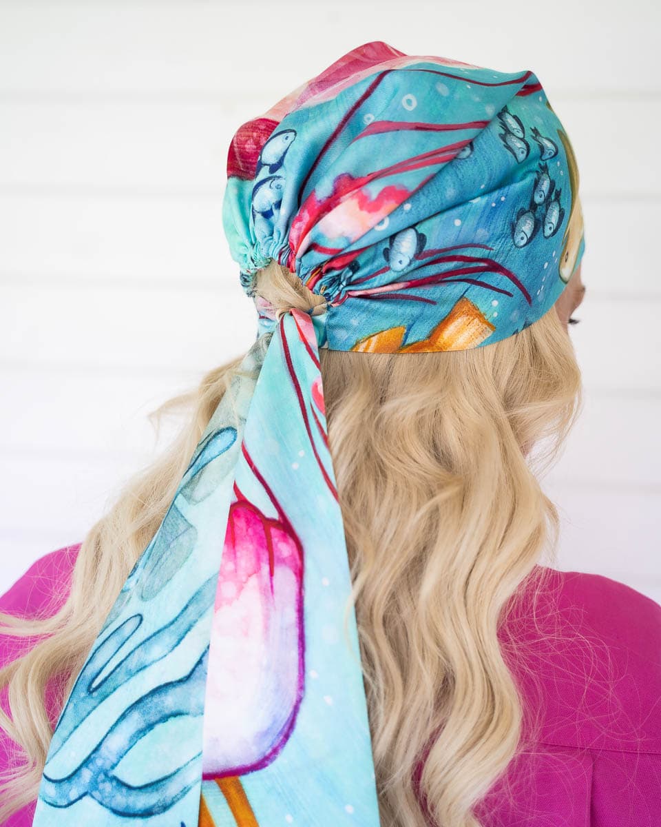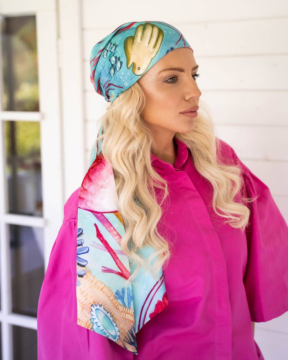 Nowa odsłona wzoru składającego hołd Matce Naturze. Podróżując po Świecie jeszcze nigdy żaden twór rąk ludzkich nie zachwycił mnie tak, jak dzieła natury. Rafy koralowe są na to najlepszym dowodem. Często przemierzamy szmat drogi, żeby zobaczyć te wszystkie piękne miejsca. Podróżujemy i niestety odkrywając świat natury zostawiamy po sobie ślad w postaci śmieci. O tym, jak duży to problem przekonałam się będąc na Madagaskarze czy Malediwach. Piękna na pierwszy rzut oka apaszka, ukazująca obfitość rafy koralowej kryje w sobie mnóstwo śmieci: foliówki, słomki plastikowe, żarówki, jednorazowe rękawiczki. Apaszka „Ocean 2.0” ma przypominać, że Ziemia jest jedna. Nie ma opcji przeprowadzki na Planetę B. Zachwycając się pięknem natury zachowajmy do niej szacunek dbając o jej czystość.