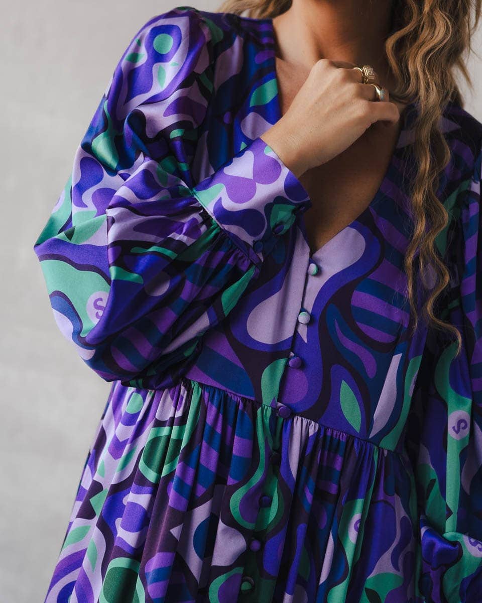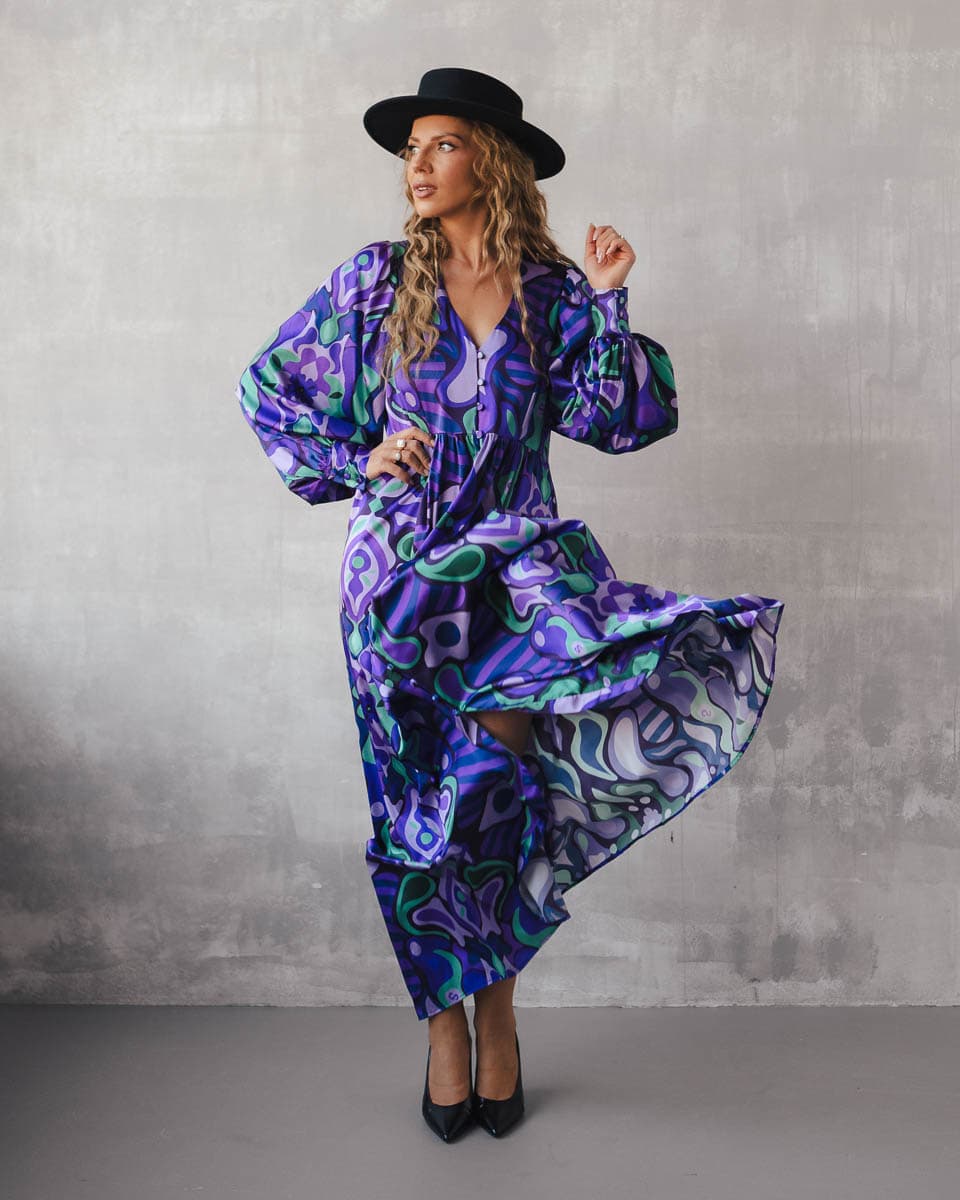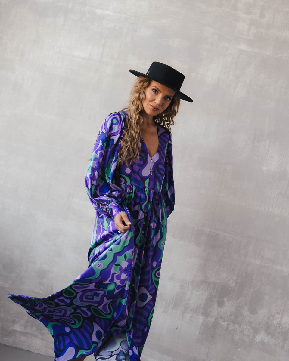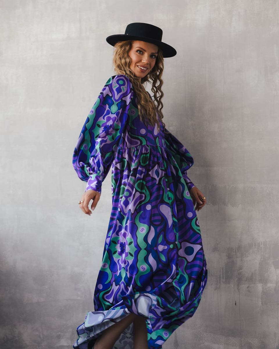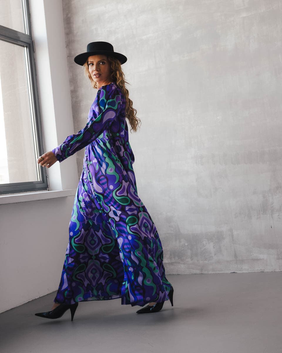 Jedwab, z którego uszyta jest sukienka pięknie faluje w ruchu, tworząc efektowne i subtelne drapowania, co nadaje całej stylizacji unikalny charakter. Jest lekka jak piórko, a jej bufiaste rękawy, zakończone eleganckimi mankietami pięknie opływają ręce. Zwieńczeniem całości są przepiękne oblekane guziczki.