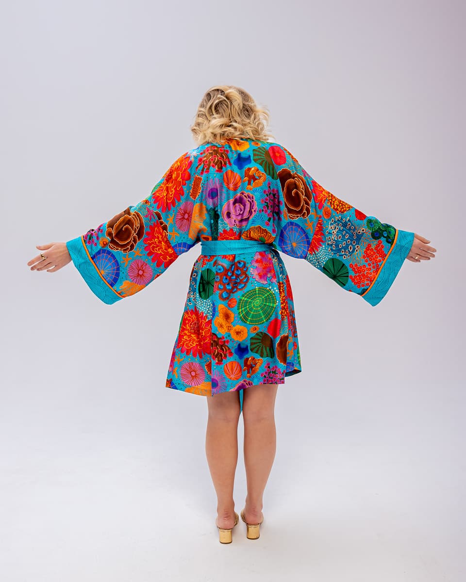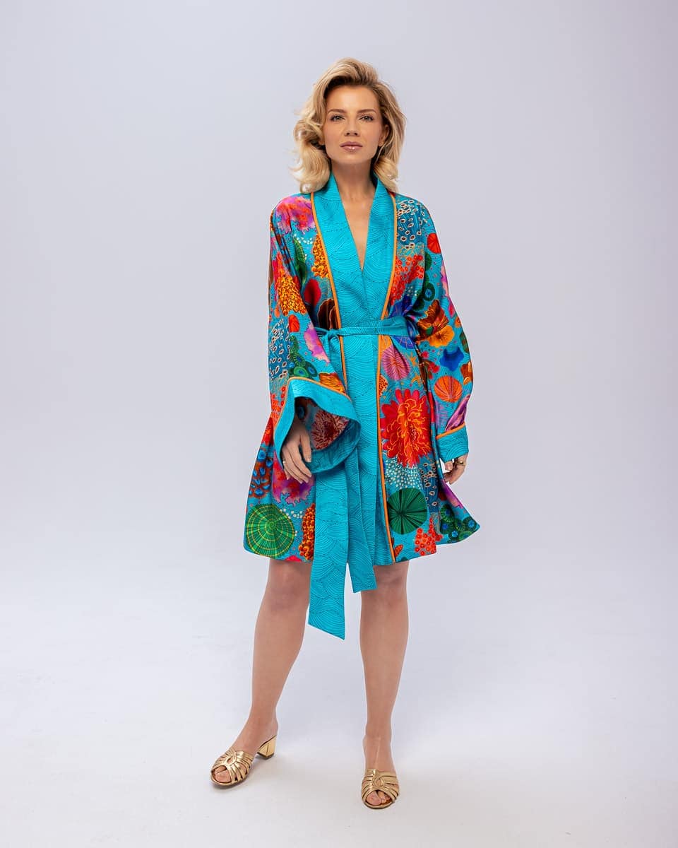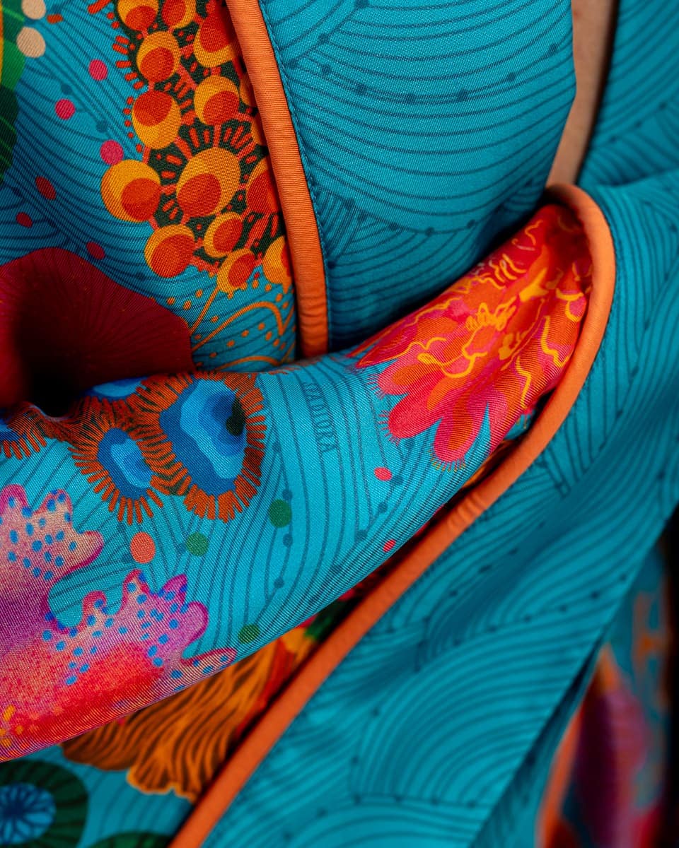 Przedstawiamy nową wyjątkową wersję kimona powstała z połączenia dwóch starannie dobranych, kolorowych fragmentów jedwabiu, tworząc harmonijną, a jednocześnie wyrazistą kompozycję. To nowa interpretacja poprzedniego modelu - bardziej odważna, pełna świeżości.