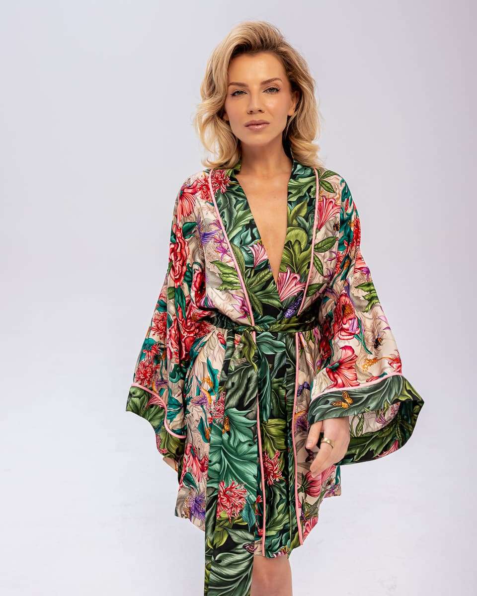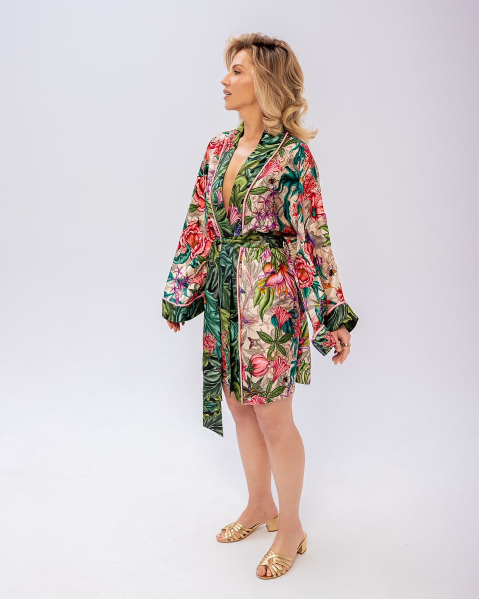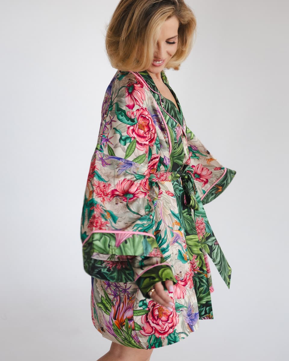 Miękki, szlachetny jedwab pięknie układa się na sylwetce, nadając całości lekkości i elegancji. Każde kimono jest unikatowe, dzięki czemu staje się nie tylko elementem garderoby, ale małym dziełem sztuki. Idealne dla osób szukających luksusu w codzienności i wyjątkowego akcentu w stylizacji.