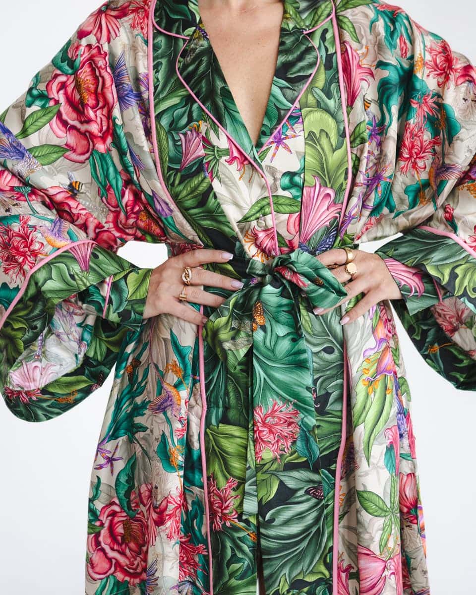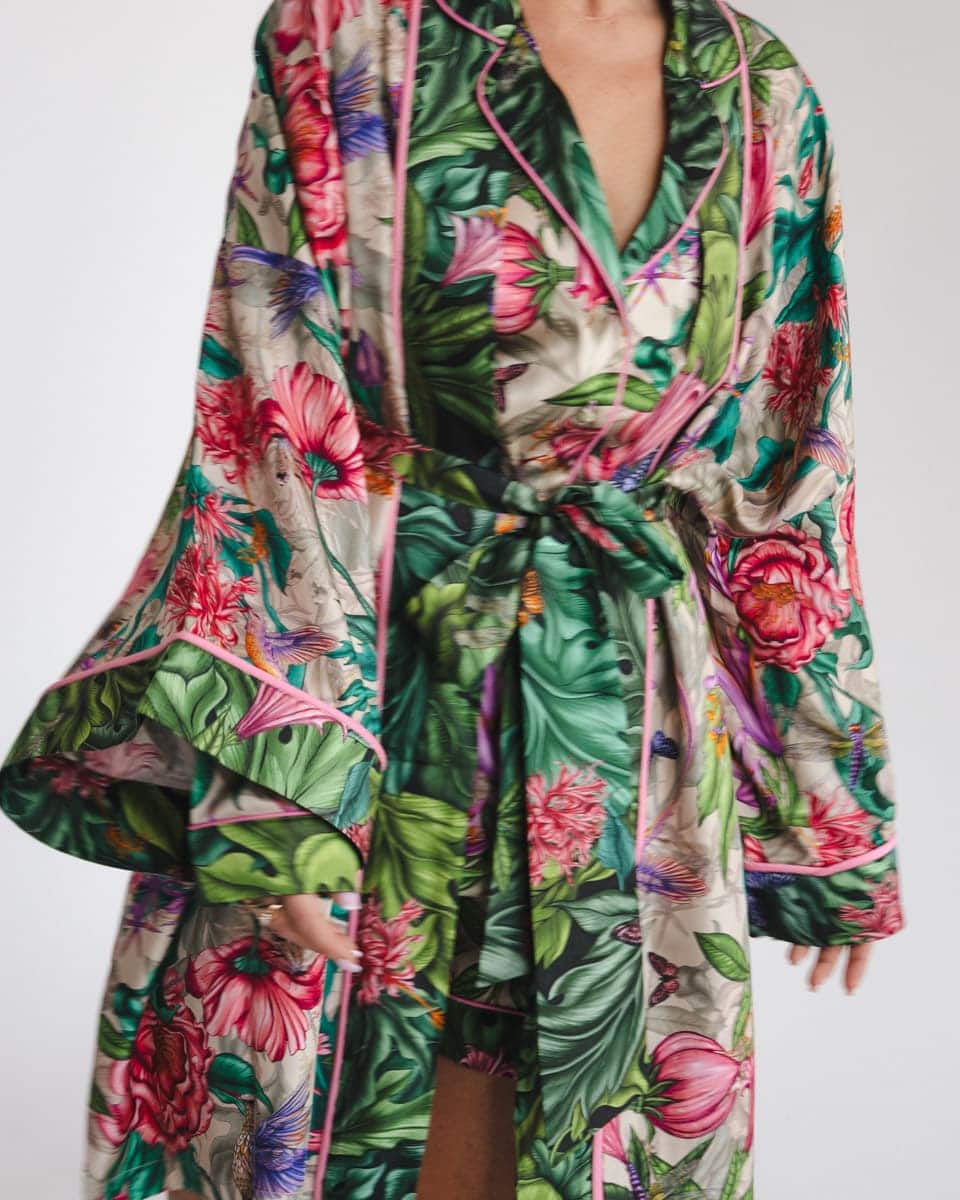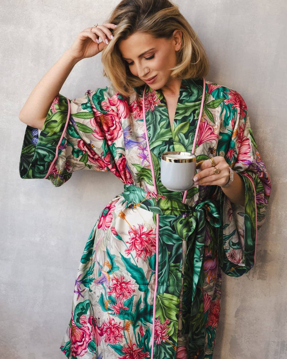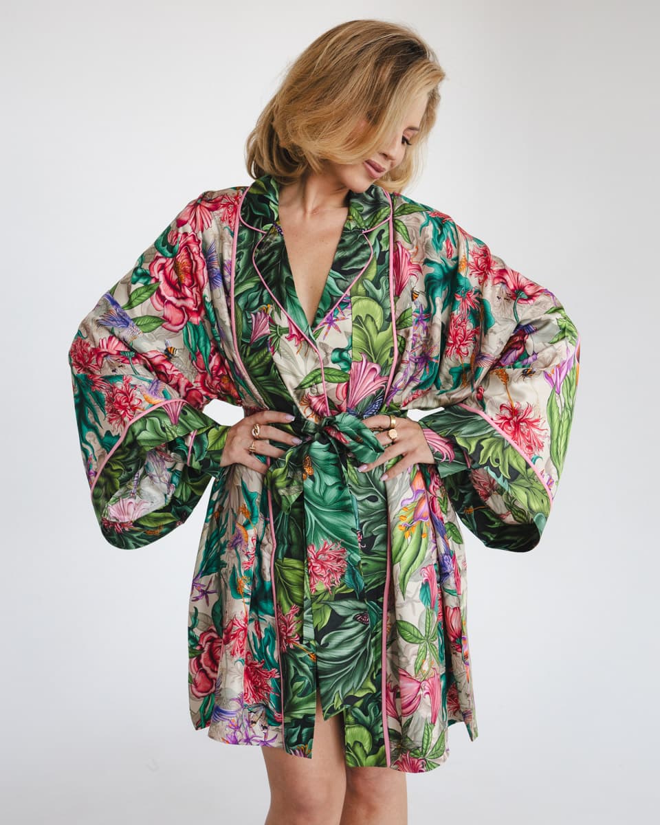 Miękki, szlachetny jedwab pięknie układa się na sylwetce, nadając całości lekkości i elegancji. Każde kimono jest unikatowe, dzięki czemu staje się nie tylko elementem garderoby, ale małym dziełem sztuki. Idealne dla osób szukających luksusu w codzienności i wyjątkowego akcentu w stylizacji.