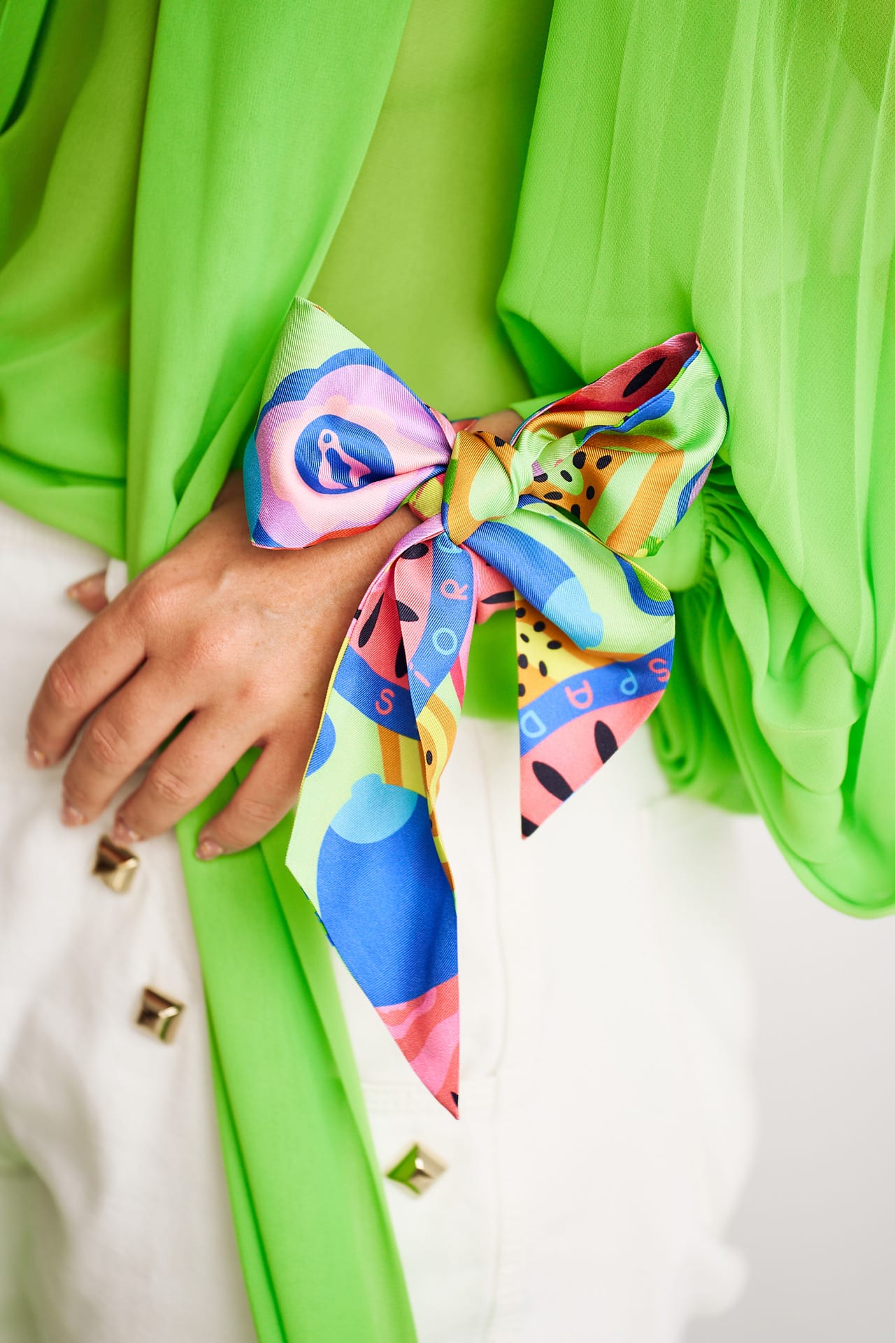 Kolejna w naszej kolekcji jedwabna wstążka typu Twilly z Waszym ulubionym wzorem "Soczysta". To modowy dodatek który na świecie święci triumfy od kilku dobrych dekad.