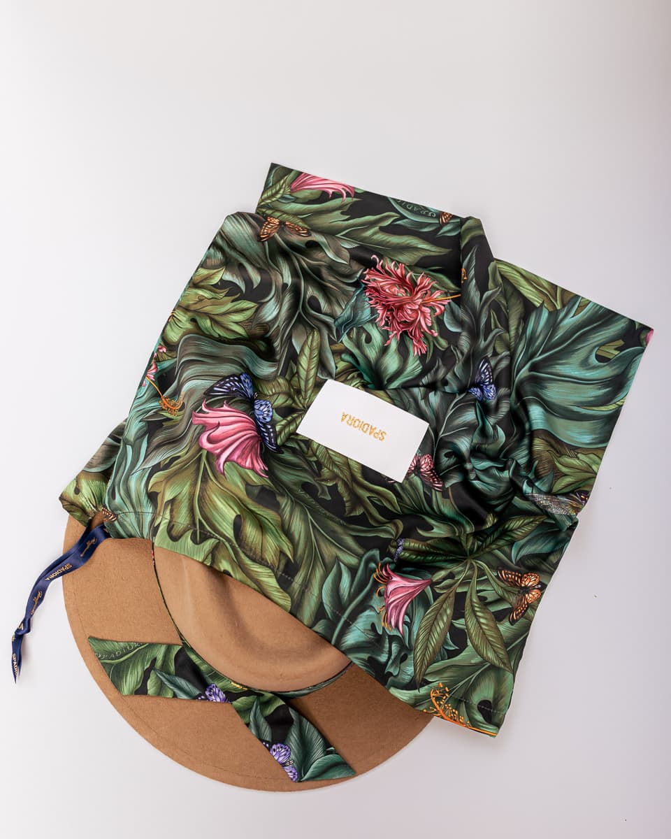 Produkt w całości zaprojektowany i uszyty ręcznie w Polsce, a jedwabna szarfa do kapelusza oraz pokrowiec powstały w pracowni krawieckiej Spadiory. Produkt najwyższej jakości stworzony z dbałością o każdy szczegół.