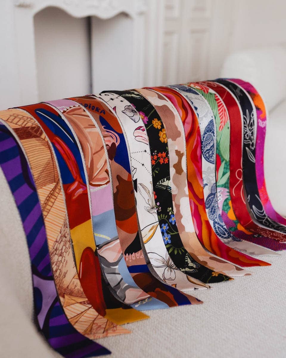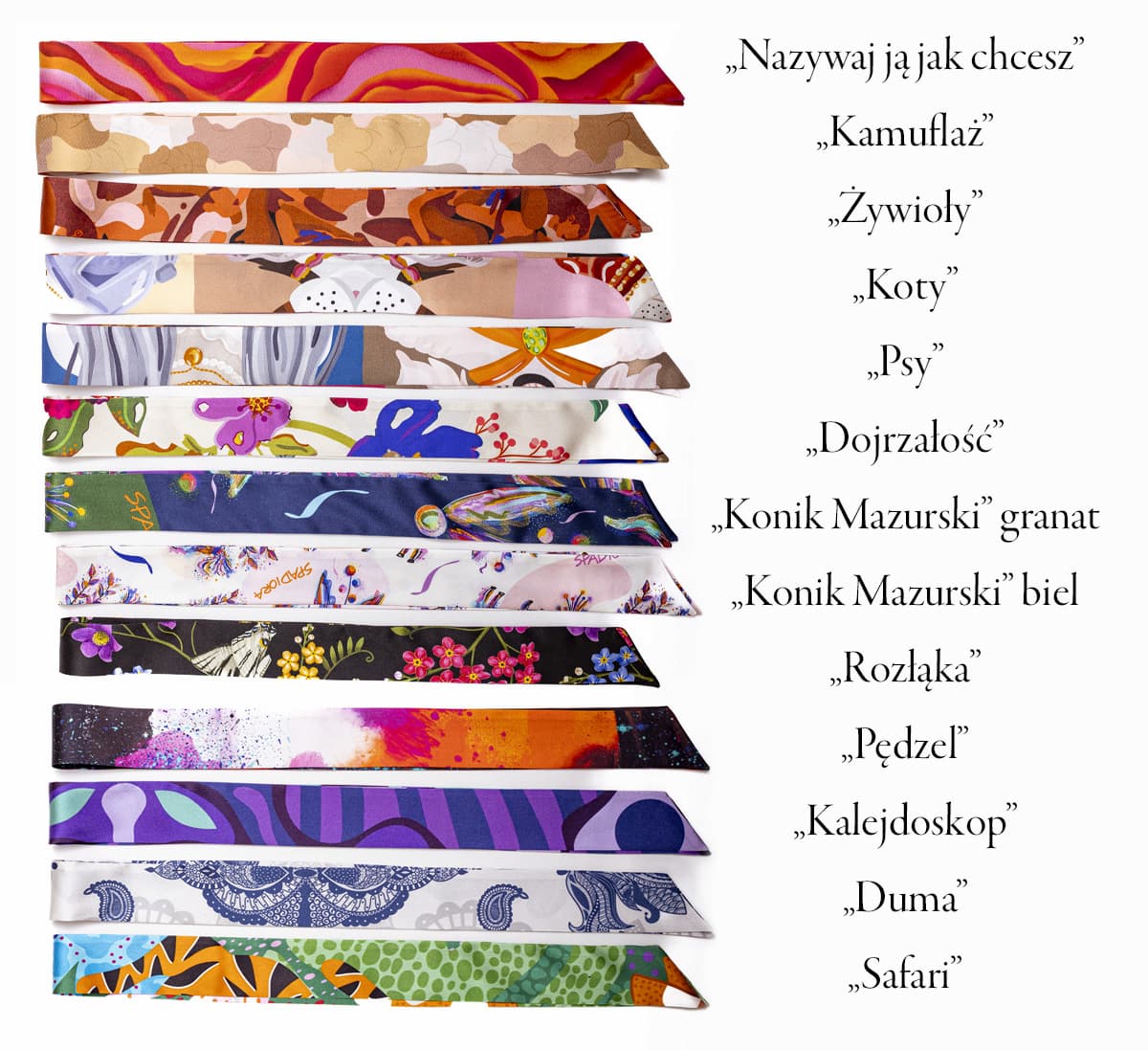 Do wyboru jedwabne szarfy we wzorach: "Pomander" zielony, "Pomander" różowy, "Żywioły", "Rozłąka", "Koty", "Psy","Kalejdoskop", "Safari", "Pędzel" "Duma","Kwiaty Zodiaku", "Feminimal" bordo, " Wiatraki", "Soczysta".