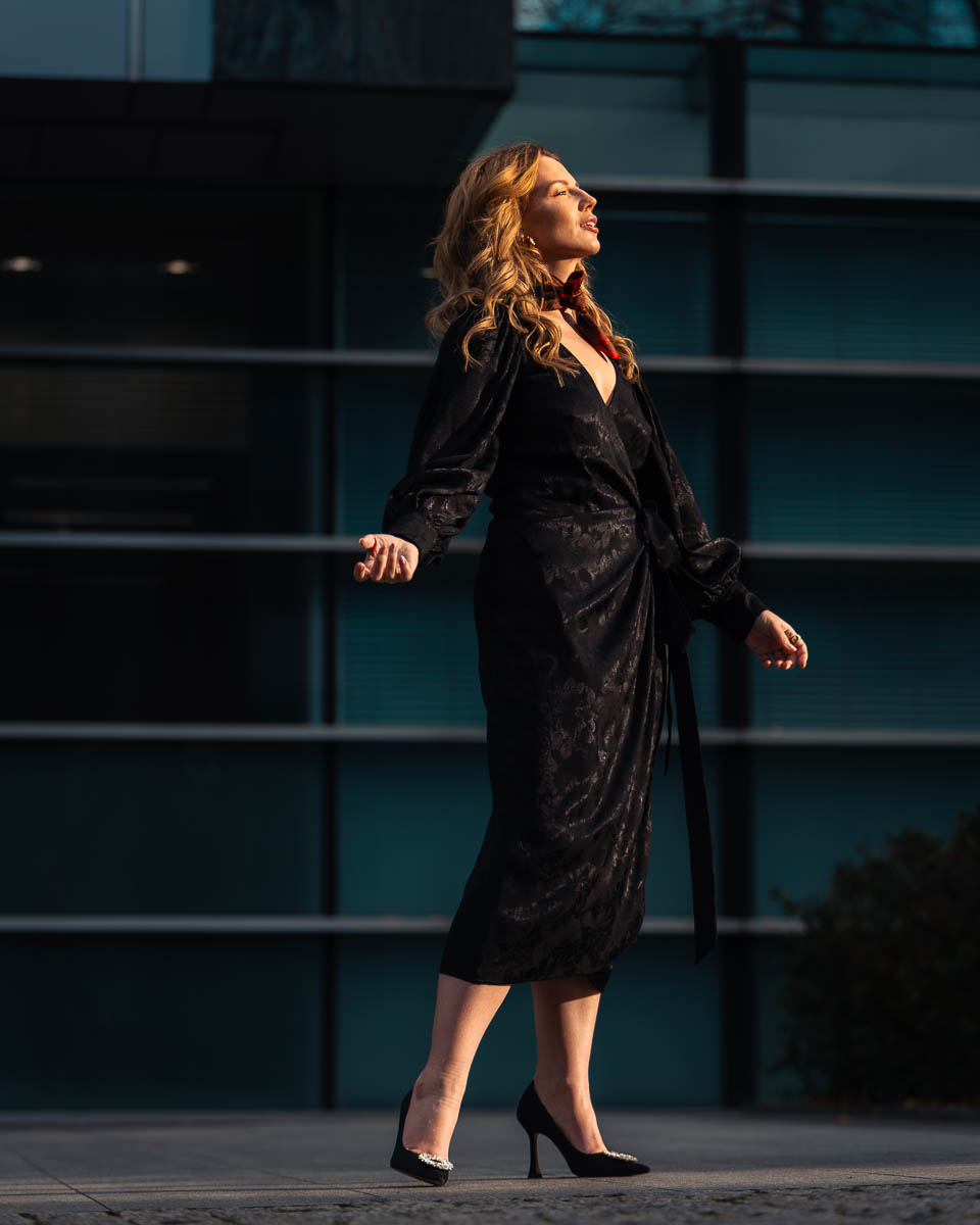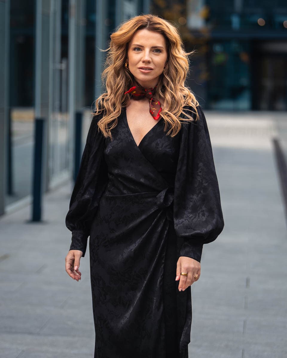 Sukienka Carmo to gratka dla wszystkich fanek klasyki z nutką nowoczesności. Wykonana z wiskozy żakardowej sukienka typu wrap dopasuje się do każdej kobiecej sylwetki podkreślając jej atuty. Ponadczasowość kroju w połączeniu z najwyższą jakością tkaniny oraz kunsztem wykonania sprawią, że sięgniesz po tę sukienkę na wiele okazji. Wiskoza pięknie się układa i opływa sylwetkę, więc sukienka Carmo subtelnie podkreśla biust i talię. Bufiaste, szerokie rękawy nadają jej niepowtarzalnego charakteru. Kopertowy krój pozwala na regulację głębokości dekoltu. Świetnie wygląda zestawiona z każdym rodzajem obuwia czy dodatków.
